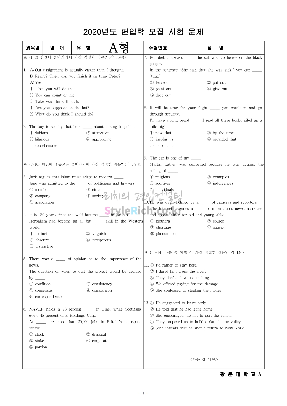 2020학년도 광운대 편입 기출문제 영어 1페이지