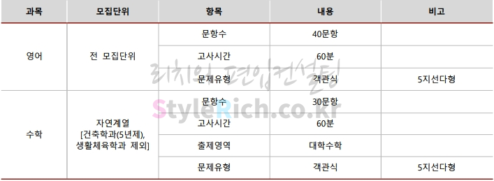 영어 필답고사는 40문항, 60분, 객관식 5지선다형, 100점 만점에 배점(1.9, 2.3, 2.9, 3.1, 3.7)은 문항마다 다르고 수학 필답고사는 30문항, 60분, 객관식 5지선다형, 100점 만점에 배점(3, 3.5, 4)은 문항마다 다릅니다.