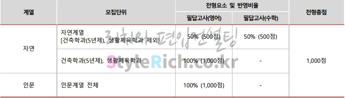 광운대 편입은 모두 일괄전형으로 자연계열[건축학과(5년제), 생활체육학과 제외]는 영어 50% + 수학 50%, 건축학과(5년제), 생활체육학과는 영어 100%, 인문계열은 영어 100%입니다.