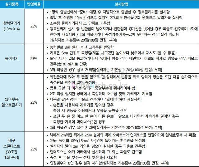 체육교육과의 실기고사는 왕복달리기, 높이뛰기, 앉아윗몸앞으로굽히기, 배구스킬테스트가 각각 25%의 비율을 차지합니다.