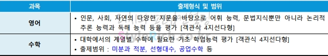 출제형식 및 범위를 살펴보면 영어는 인문, 사회, 자연의 다양한 지문을 바탕으로 어휘, 문법, 논리, 독해 능력을 객관식 4지선다형으로 평가하고, 수학은 미적분, 선형대수, 공업수학 등을 범위로 기초 학업능력을 평가합니다.