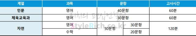 필기고사는 계열에 따라 과목이 다릅니다. 인문계열은 영어 40문항/60분, 체육교육과는 영어 30문항/60분, 자연계열은 영어+수학50문항(영어30+수학20)/120분입니다.