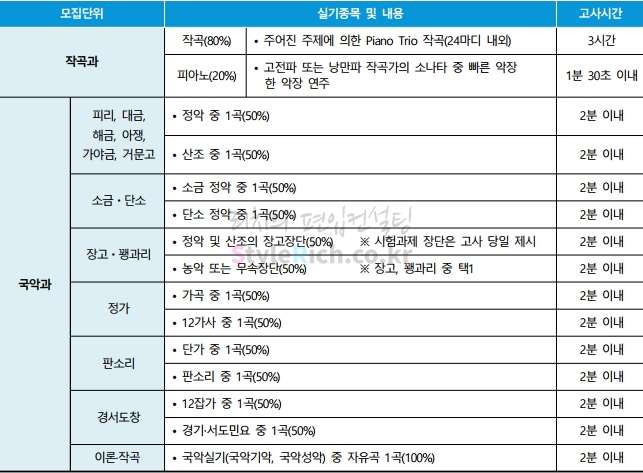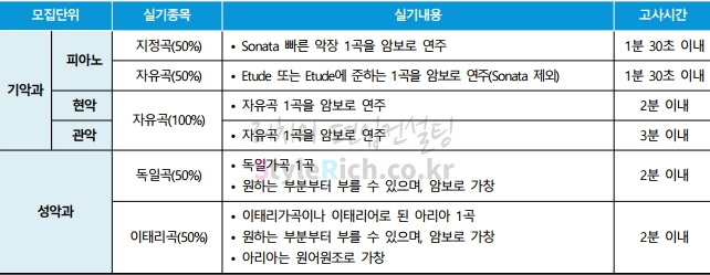 음악대학의 실기고사는 피아노에서 지정곡 50%, 자유곡 50%로 고사시간은 1분 30초 이내, 현악과 관악은 자유곡 100%로 각각 고사시간은 2분, 3분 이내, 성악과는 독일곡 50%, 이태리곡 50%로 고사시간은 각각 2분 이내, 작곡과에서 작곡 80%, 피아노 20%로 고사시간은 각각 3시간, 1분 30초 이내, 피리, 대금, 해금, 아쟁, 가야금, 거문고에서 정악 중 1곡 50%, 산조 중 1곡 50%, 소금·단소 소금 정악 중 1곡 50%, 단소 정악 중 1곡 50%, 장고·꽹과리에서 정악 및 산조의 장고장단 50%, 농악 또는 무속장단 50%, 정가에서 가곡 중 1곡 50%, 12가사 중 1곡 50%, 판소리에서 단가 중 1곡 50%, 판소리 중 1곡 50%, 경서도창에서 12잡가 중 1곡 50%, 경기·서도민요 중 1곡 50%, 이론·작곡에서 국악실기 중 자유곡 1곡 100%로 각 고사시간은 2분 이내입니다.
