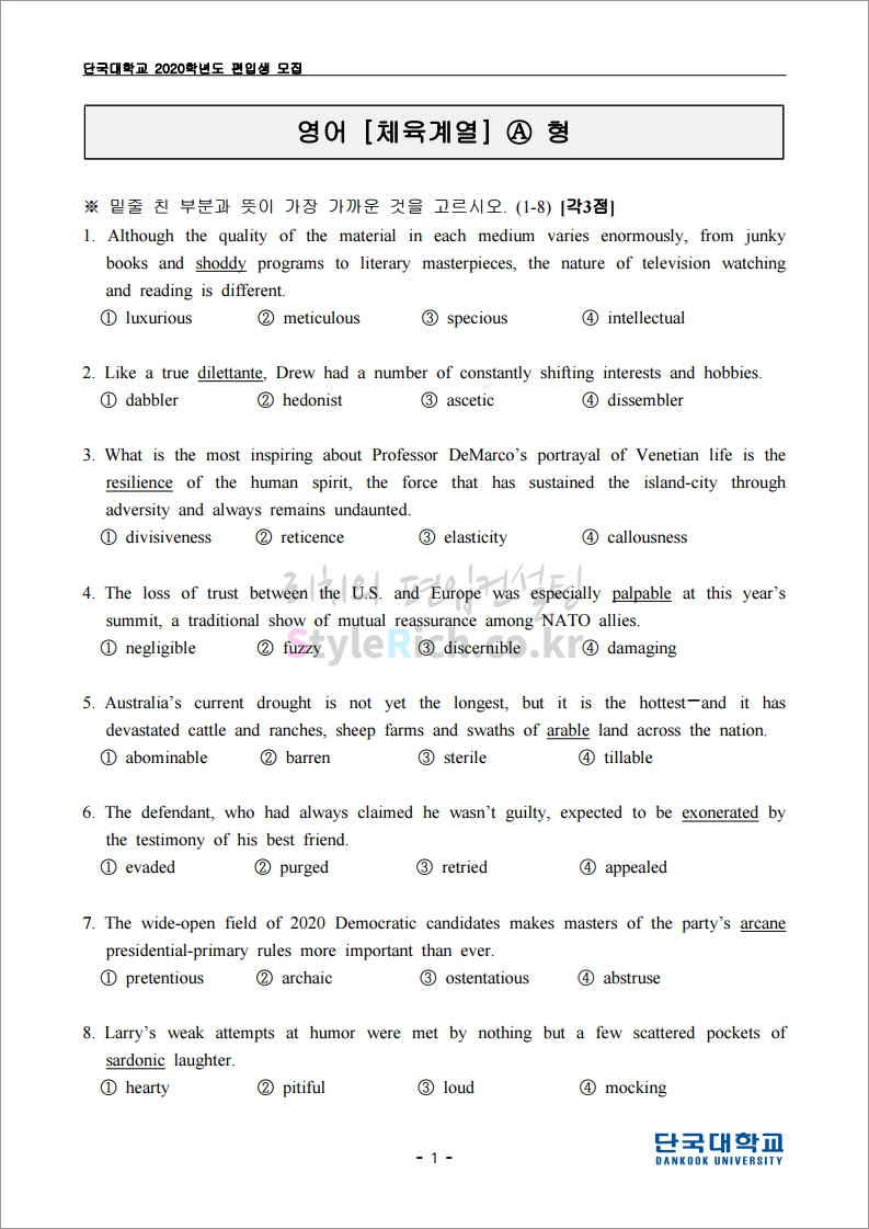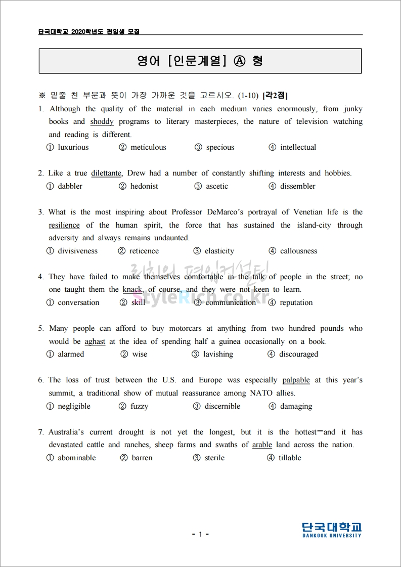 2020학년도 단국대(죽전) 편입 필기고사 기출문제 다운받기