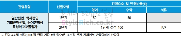 자연계열의 일반편입, 학사편입, 기회균형선발, 농어촌학생, 특성화고교졸업자는 다단계전형으로 1단계에서 영어 50%, 수학50%, 2단계에서 1단계 성적 100%, 서류는 P/F입니다.