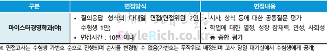 면접은 질의응답 형식의 2:1 면접으로 10분이내로 합니다. 시사, 상식의 공통질문과 학업의 열정, 성장잠재력, 인성, 사회성 등을 종합적으로 평가합니다.