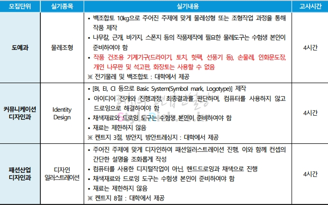미술계열의 실기고사는 도예과에서 물레조형, 커뮤니케이션디자인과에서 Identity Design, 패션산업디자인과에서 디자인 일러스트레이션을 실시하며 각각의 고사시간은 4시간입니다.