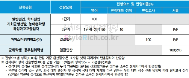 인문계열의 일반편입, 학사편입, 기회균형선발, 농어촌학생, 특성화고교졸업자는 다단계전형으로 1단계에서 영어 100%, 2단계에서 1단계 성적 80, 전적대 성적 20%를 반영하고 서류는 P/F입니다. 마이스터경영학과(야)는 일괄합산으로 면접고사 100%, 서류는 P/F입니다. 군위탁생, 공무원위탁생은 일괄합산으로 서류만 P/F 입니다.