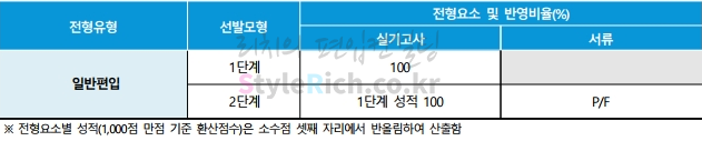 예능계열의 일반편입은 다단계전형으로 1단계에서 실기고사 100%, 2단계에서 1단계 성적 100%, 서류는 P/F입니다.