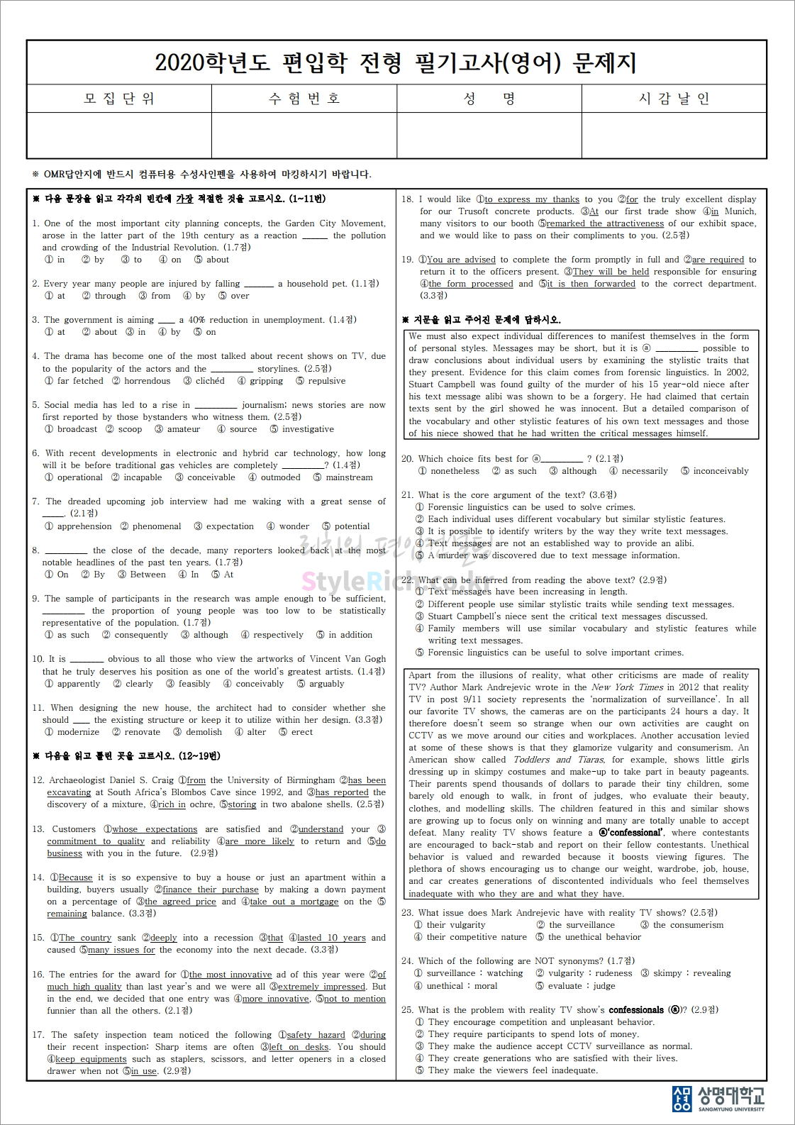 2020학년도 상명대 편입 기출문제 영어 1페이지