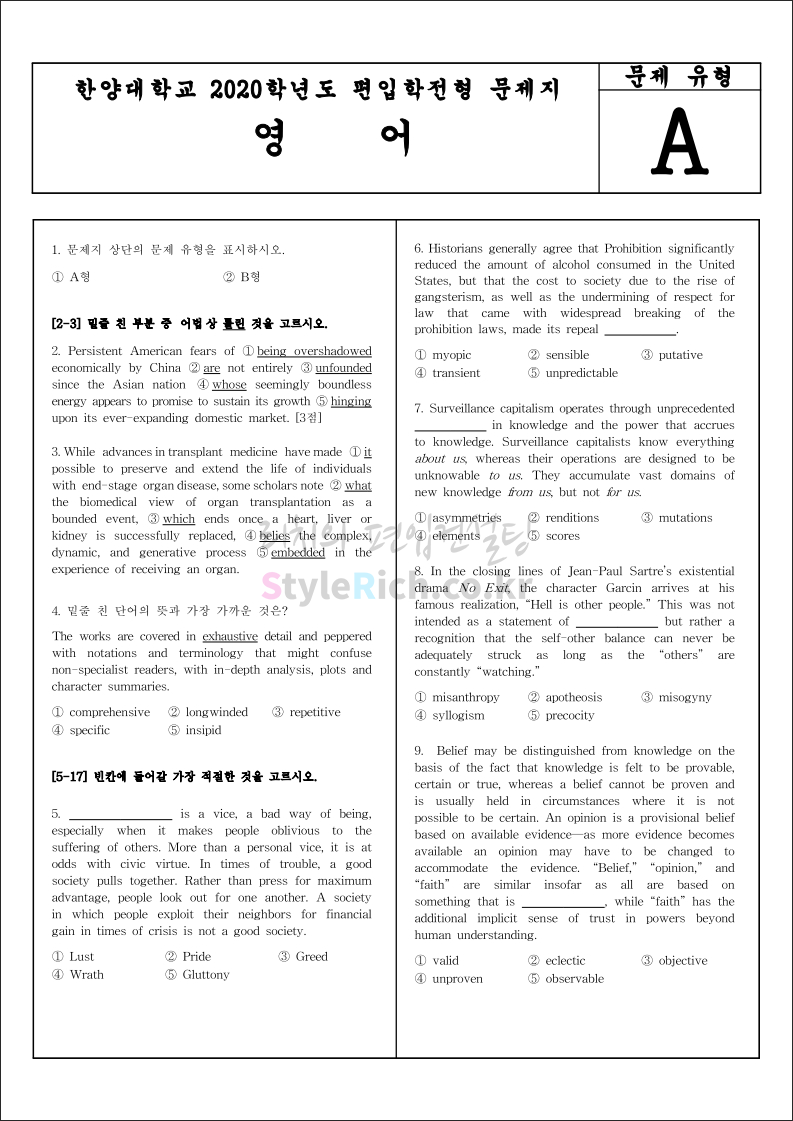 2020학년도 한양대 편입 기출문제(영어) 1페이지