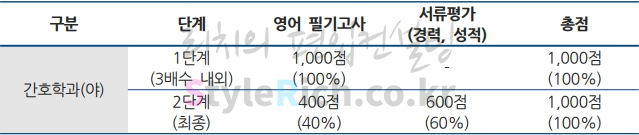 2020학년도 한양대 간호학과(야) 편입은 1단계 영어 100%, 2단계 영어 40%, 서류 60%입니다.