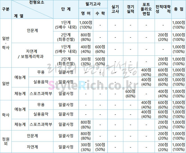 2020학년도 한양대(에리카) 일반편입, 학사편입에서 인문계는 다단계 전형으로 1단계 영어 100%, 2단계 영어 80%, 전적대 성적 20%이고, 자연계, 보험계리학과는 다단계 전형으로 1단계 영어 40%, 수학 60%, 2단계 영어 30%, 수학 50%, 전적대 성적 20%입니다. 예능계는 일괄전형으로 포트폴리오 면접 40%, 전적대 성적 60%입니다. 체능계의 일반편입은 일괄전형으로 경기실적 60%, 전적대 성적 40%이고, 학사편입은 일괄전형으로 영어 80%, 전적대 성적 20%입니다. 정원외의 인문계는 일괄전형으로 영어 80%, 전적대 성적 20%이고, 자연계는 일괄전형으로 영어 30%, 수학 50%, 전적대 성적 20%입니다.
