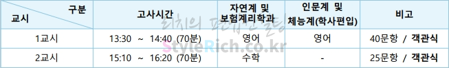 2020학년도 한양대(에리카) 편입 필기고사에서 영어는 40문항/70분, 객관식 4지선다형으로 100점 만점에 문항당 배점은 2, 3점으로 구성되어 있습니다. 수학은 25문항/70분, 객관식 4지선다형으로 100점 만점에 문항당 배점은 3, 4, 5점으로 구성되어 있습니다.