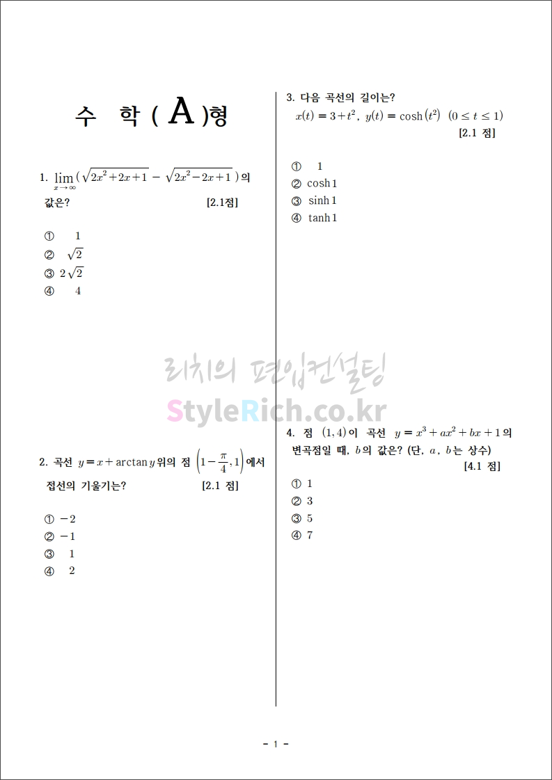 2021학년도 가천대 편입 수학 기출문제는 25문항/60분, 객관식 4지선다형이며, 총점 100점 만점에 문항당 배점은 다릅니다. 영어 기출문제는 40문항/60분, 객관식 4지선다형이며, 총점 100점 만점에 문항당 배점은 1~8번은 1.2점, 9~13번은 2.1점, 14~21번은 2.4점, 22~31번은 3.1점, 32~40번은 3.3점으로 다릅니다.