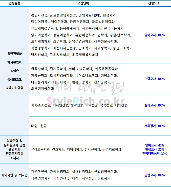 의료인력 및 유치원교사 양성 관련학과 전문학사학위 소지자 전형에서 유아교육, 간호학과, 치위생학과, 방사선학과, 물리치료학과는 영어 40%, 면접 30%, 성적 30%를 반영합니다.