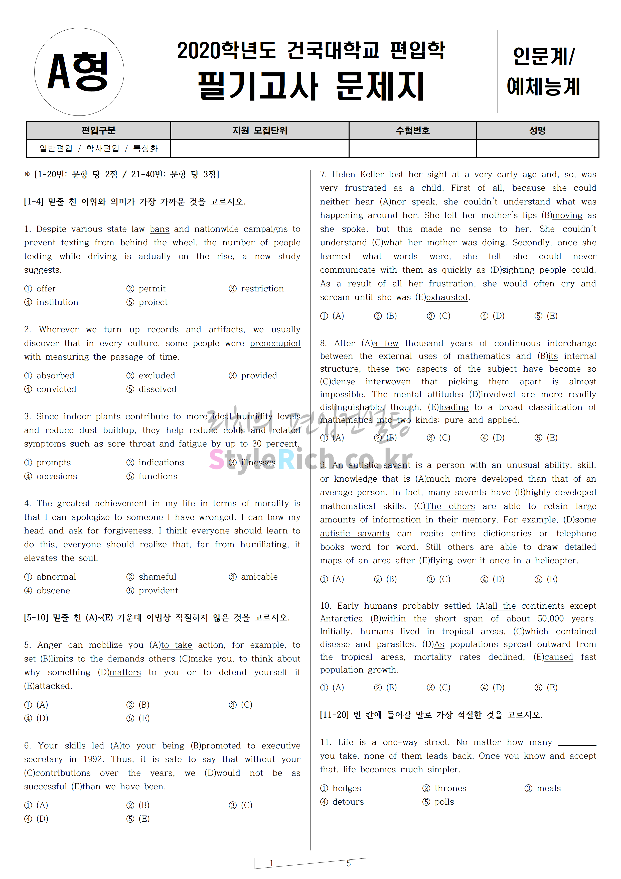 2020학년도 건국대 편입 기출문제가 궁금하다면?
