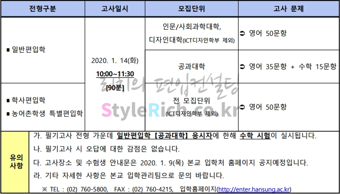 2020학년도 한성대 편입 인문,사회과학,공과대학, 디자인대학(글로벌패션산업학부,뷰티디자인매니지먼트학과) 전형방법은 필기고사 100%입니다.