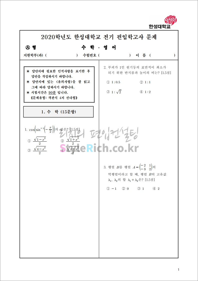 2020학년도 한성대 편입 기출문제가 궁금하다면?