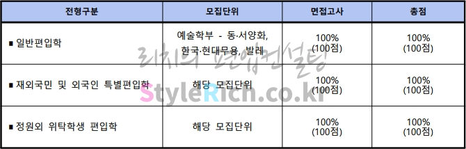 2020학년도 한성대 일반편입 예술학부, 재외국민 및 외국인 특별전형편입, 정원외 위탁학생 편입은 면접고사 100%입니다.
