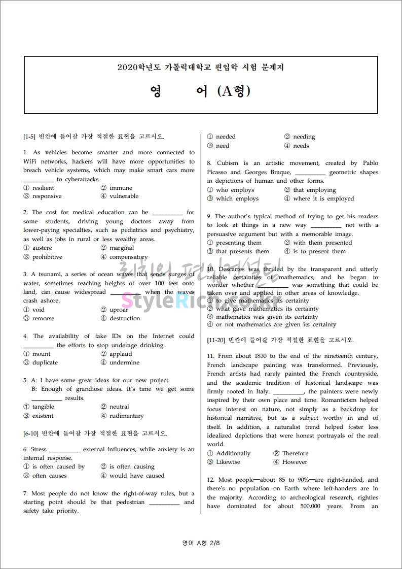 2020학년도 가톨릭대 편입 인문사회/생활과학부/의학과/간호학과의 영어 필기고사는 40문항/90분, 객관식 4지 선다형, 총 100점 만점에 배점은 문항 당 2.5점으로 추정됩니다. 자연·공학 영어,수학 필기고사는 총 40문항(영어 20, 수학20)/90분, 객관식 4지선다형, 총 100점 만점에 배점은 문항 당 2.5점으로 추정됩니다.