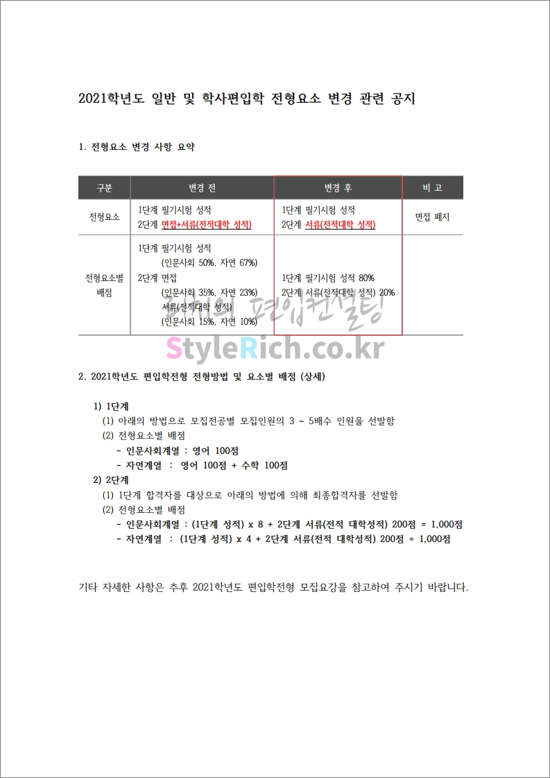 '이번 서강대 편입 전형변경은 코로나19로 인해 면접이 어려워져 면접폐지되었다. 이로 인해 남은 비율을 필기시험과 성적에 배분하였다. 이 때 필기시험에 비중이 상대적으로 더 많이 배분되었고 중요도가 매우 높아졌다. 2단계 변별력은 예전과 달리 약화되어 2단계에서 역전하기는 어려워졌다. 서강대의 특성상 일시적 변경일 가능성이 높고 추후 다시 원래대로 바뀔 확률이 높다.'