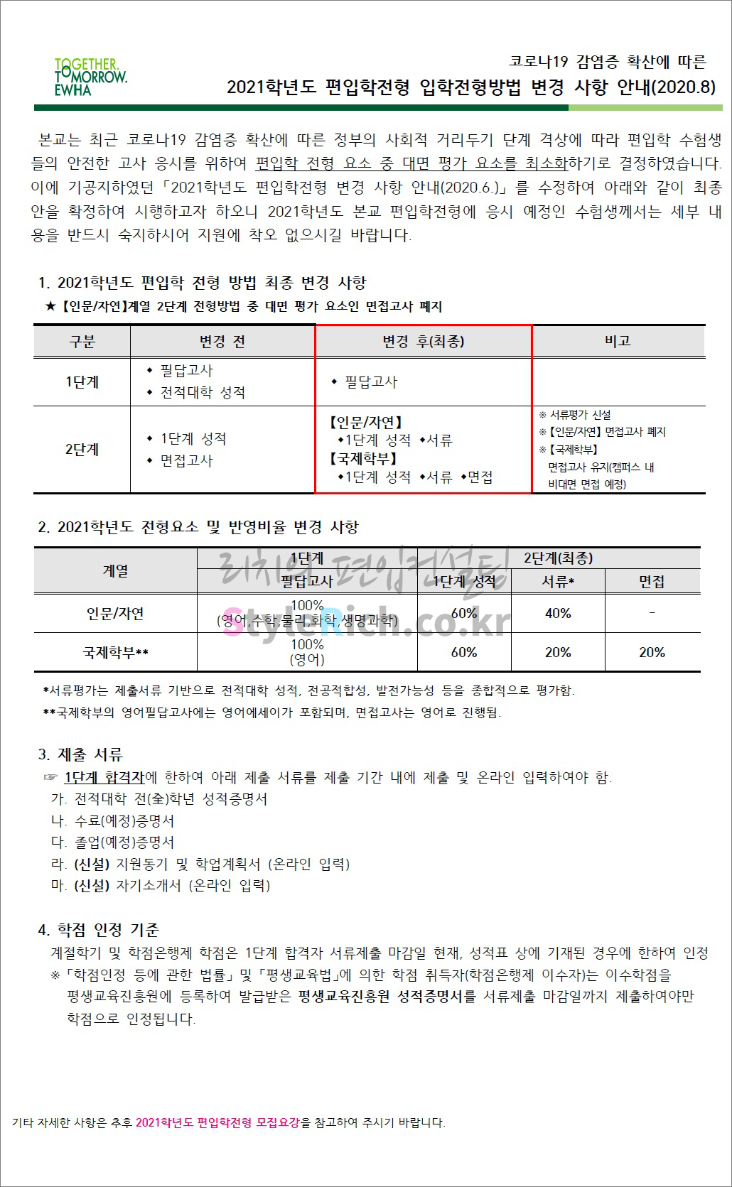코로나19로 예외 없이 이화여대도 2021학년도 편입전형 변경사항을 발표하였습니다. 과연 무엇이 바뀌고 핵심은 무엇인지 분석해 보겠습니다.