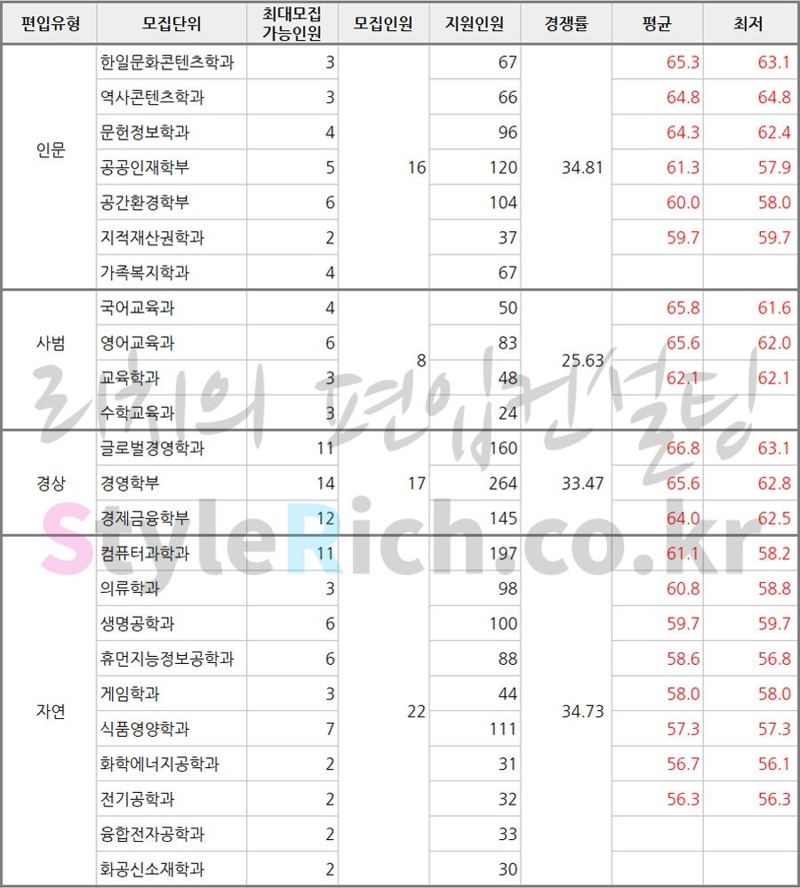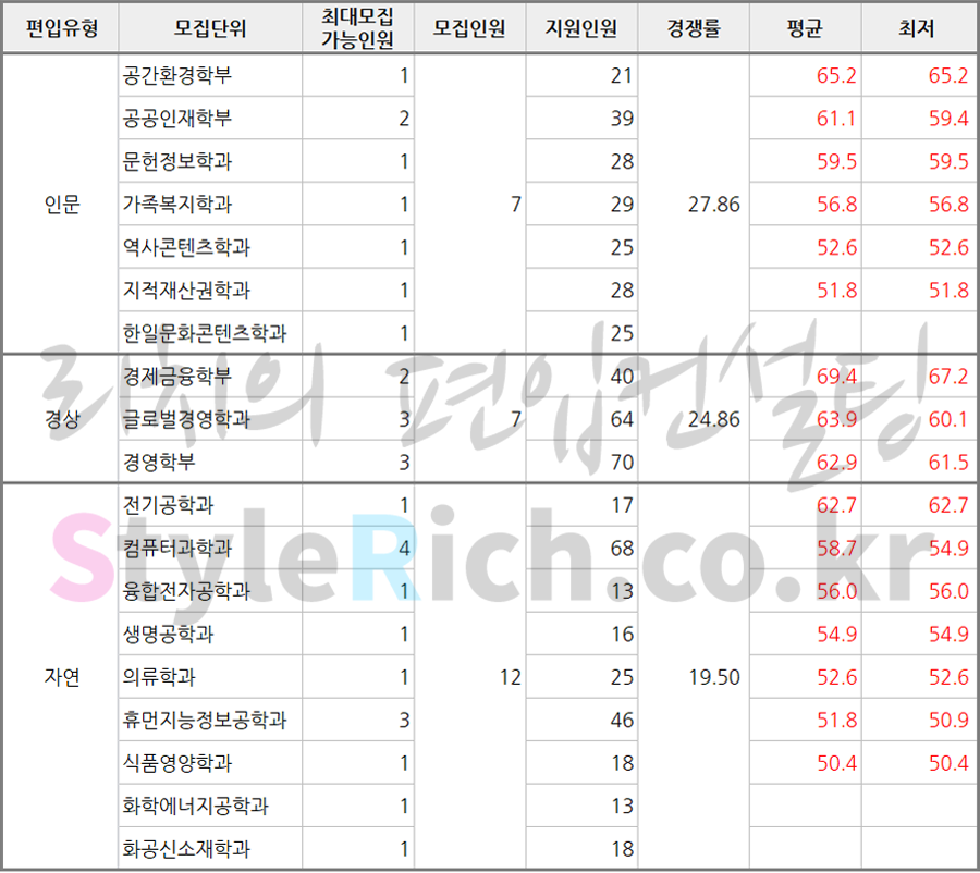 상명대 편입 2020학년도 합격점수(평균점수, 커트라인)을 알아보자! 2020.10.11 15:33 편입 합격점수 & 추가합격/2020학년도 합격점수 & 추가합격 2020학년도 상명대 편입 합격점수를 살펴보겠습니다. * 모집단위는 인문, 사범, 경상, 자연으로 분류 후 합격점수 평균이 높은 순으로 정렬* 모집단위의 모집인원, 지원인원은 있으나 합격점수가 없는 경우는 같은 편입유형에 있는 타 모집단위보다 상대적으로 지원자의 점수가 낮아 경쟁에서 밀려 선발되지 못한 것으로 추정(상명대 편입 모집방식을 모집요강에서 참고할 것) 2020학년도 상명대 일반편입 합격점수 2020학년도 상명대 일반편입 합격점수 2020학년도 상명대 학사편입 합격점수 2020학년도 상명대 학사편입 합격점수 <출처: 상명대> 2020학년도 상명대학교 신입생 대학생활 안내 (서울) 공유하기 게시글 관리 리치의 편입컨설팅 저작자표시 비영리 변경금지 (새창열림) '편입 합격점수 & 추가합격 > 2020학년도 합격점수 & 추가합격' 카테고리의 다른 글 삼육대 편입 2020학년도 합격점수(평균점수, 커트라인)을 알아보자! (0) 2020.10.25 서울과학기술대 편입 2020학년도 합격점수(평균점수, 커트라인)을 알아보자! (0) 2020.10.13 인천대 편입 2020학년도 합격점수(평균점수, 커트라인)을 알아보자! (0) 2020.10.11 광운대 편입 2020학년도 합격점수(평균점수, 커트라인)을 알아보자! (0) 2020.10.10 단국대(죽전) 편입 2020학년도 합격점수(평균점수, 커트라인)을 알아보자! (0) 2020.10.05 댓글 공유하기 다른 글 댓글 이 글 공유하기 구독하기 구독하기 카카오톡 카카오톡 라인 라인 트위터 트위터 Facebook Facebook 카카오스토리 카카오스토리 밴드 밴드 네이버 블로그 네이버 블로그 Pocket Pocket Evernote Evernote 다른 글 서울과학기술대 편입 2020학년도 합격점수(평균점수, 커트라인)을 알아보자! 서울과학기술대 편입 2020학년도 합격점수(평균점수, 커트라인)을 알아보자! 2020.10.13 인천대 편입 2020학년도 합격점수(평균점수, 커트라인)을 알아보자! 인천대 편입 2020학년도 합격점수(평균점수, 커트라인)을 알아보자! 2020.10.11 광운대 편입 2020학년도 합격점수(평균점수, 커트라인)을 알아보자! 광운대 편입 2020학년도 합격점수(평균점수, 커트라인)을 알아보자! 2020.10.10 단국대(죽전) 편입 2020학년도 합격점수(평균점수, 커트라인)을 알아보자! 단국대(죽전) 편입 2020학년도 합격점수(평균점수, 커트라인)을 알아보자! 2020.10.05 다른 글 더 둘러보기