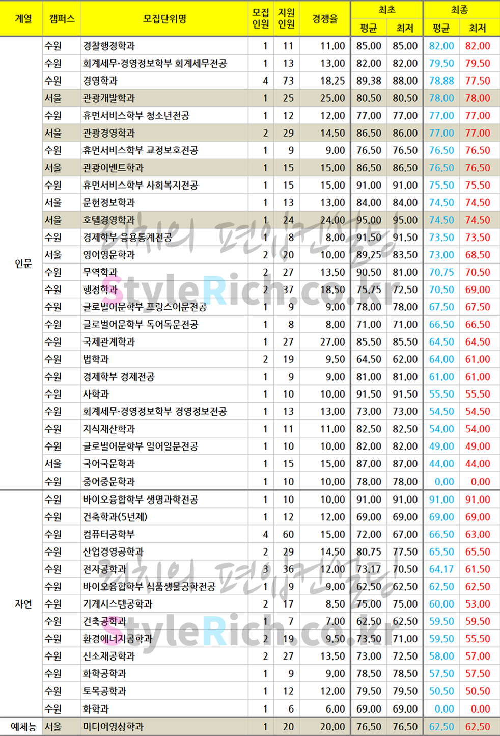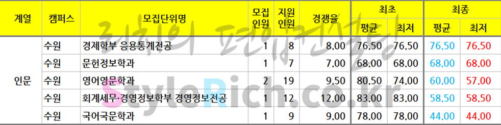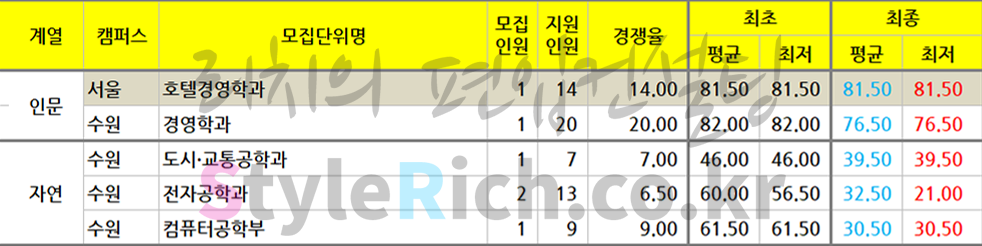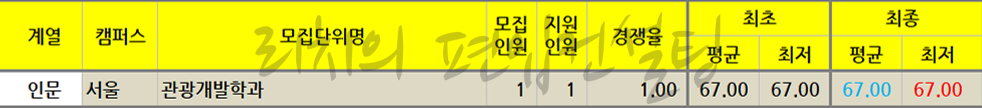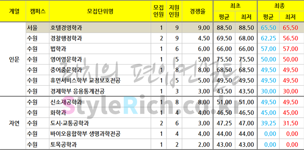 * 인문의 관광개발학과는 최초합격자 기준으로 합격점수가 1위학과였으나 최종등록자가 없어 순위에서 제외되었으니 참고하세요. 최종등록을 하지 않을 거라면 미리 등록포기하여 다른 예비합격자에게 양보를 했으면 어땠을까하는 아쉬움이 남는 결과입니다.