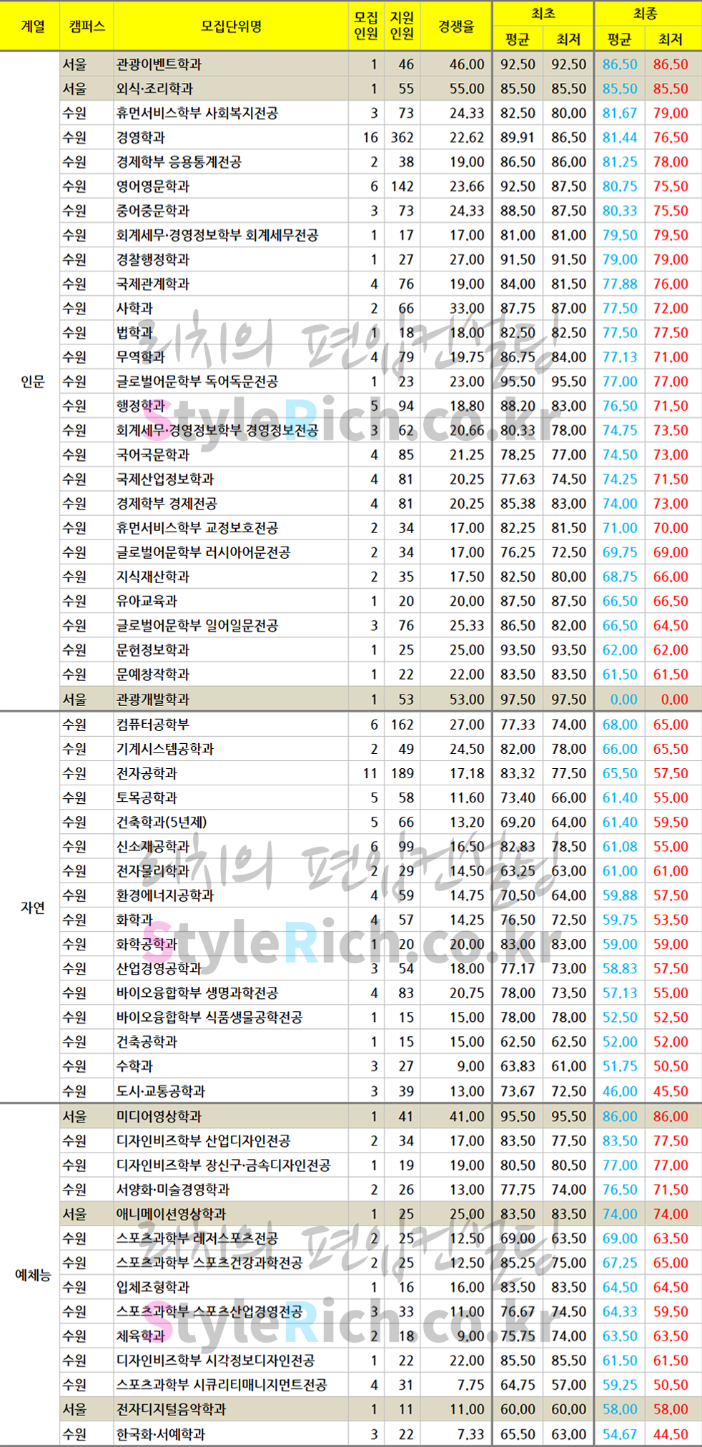 * 예체능은 1개의 학과만 있어 순위 제외