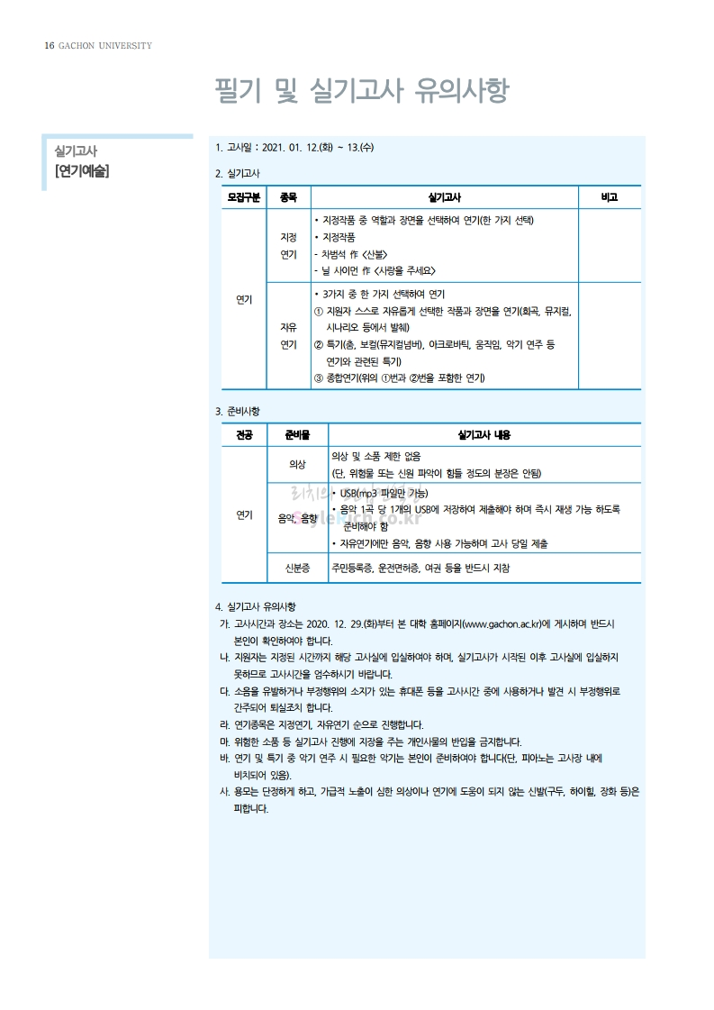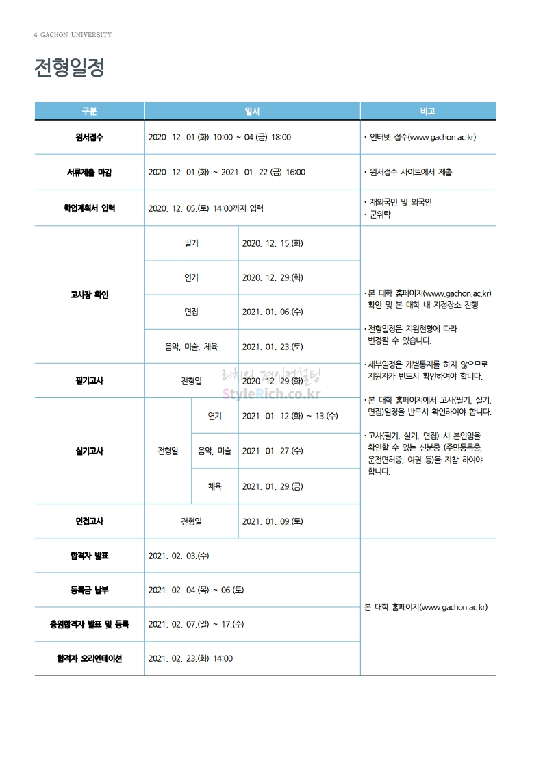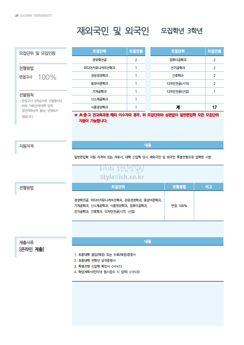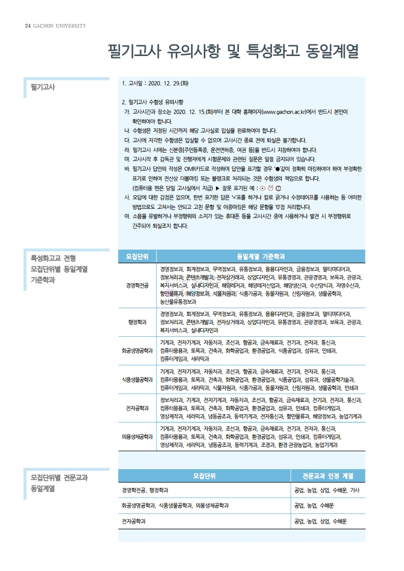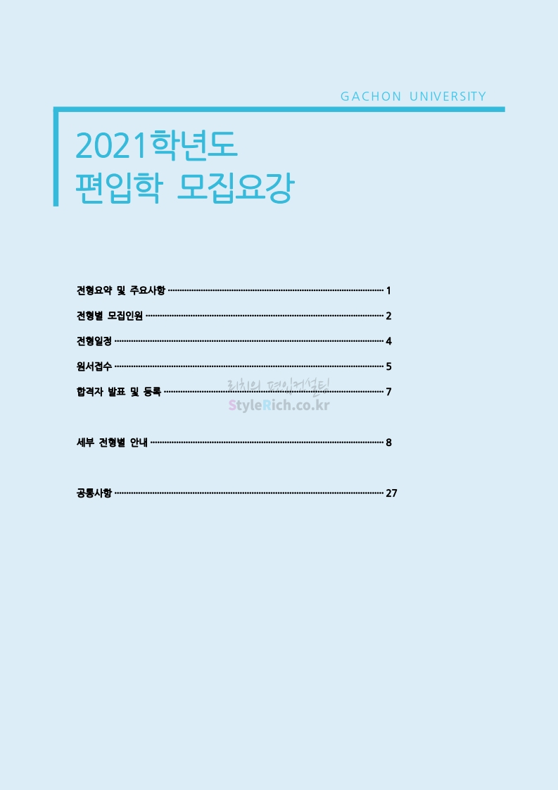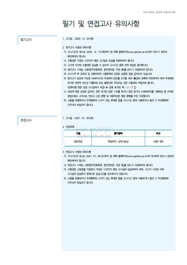 가천대 편입 2021학년도 모집요강 간편하게 보자! 2020.11.27 01:14 편입 모집요강/2021학년도 모집요강 2021학년도 가천대 편입 모집요강(2020.11.26 기준)을 간편하게 확인하세요. PC나 모바일에서 이미지를 클릭(터치) 후 이미지의 좌우측을 클릭(터치)하면 모집요강의 순서를 앞뒤로 넘길 수 있습니다. 좌측 클릭(터치)는 이전 페이지, 우측 클릭(터치)는 다음 페이지입니다. *최종 모집요강 발표 이후에도 내용의 일부가 변경될 수 있으니 지원 전 반드시 가천대 입학처의 모집요강을 확인 바랍니다. 2021학년도 가천대 편입 모집요강 다운받기 2021학년도+가천대학교+편입학+모집요강.pdf 0.58MB <출처: 가천대> KR탐색 건너뛰기9+ 0:29 / 7:42가천대학교 통학방법을 알아보자! 공유하기 게시글 관리 리치의 편입컨설팅 저작자표시 비영리 변경금지 (새창열림) '편입 모집요강 > 2021학년도 모집요강' 카테고리의 다른 글 한국항공대 편입 2021학년도 모집요강 간편하게 보자! (0) 2020.11.29 국민대 편입 2021학년도 모집요강 간편하게 보자! (0) 2020.11.29 서울대 편입 2021학년도 모집요강 간편하게 보자! (0) 2020.11.26 2021학년도 건국대 편입 전형변경이 갖는 의미는? (0) 2020.10.18 2021학년도 이화여대 편입 전형변경이 갖는 의미는? (0) 2020.10.03 댓글 공유하기 다른 글 댓글 이 글 공유하기 구독하기 구독하기 카카오톡 카카오톡 라인 라인 트위터 트위터 Facebook Facebook 카카오스토리 카카오스토리 밴드 밴드 네이버 블로그 네이버 블로그 Pocket Pocket Evernote Evernote 다른 글 한국항공대 편입 2021학년도 모집요강 간편하게 보자! 한국항공대 편입 2021학년도 모집요강 간편하게 보자! 2020.11.29 국민대 편입 2021학년도 모집요강 간편하게 보자! 국민대 편입 2021학년도 모집요강 간편하게 보자! 2020.11.29 서울대 편입 2021학년도 모집요강 간편하게 보자! 서울대 편입 2021학년도 모집요강 간편하게 보자! 2020.11.26 2021학년도 건국대 편입 전형변경이 갖는 의미는? 2021학년도 건국대 편입 전형변경이 갖는 의미는? 2020.10.18 다른 글 더 둘러보기
