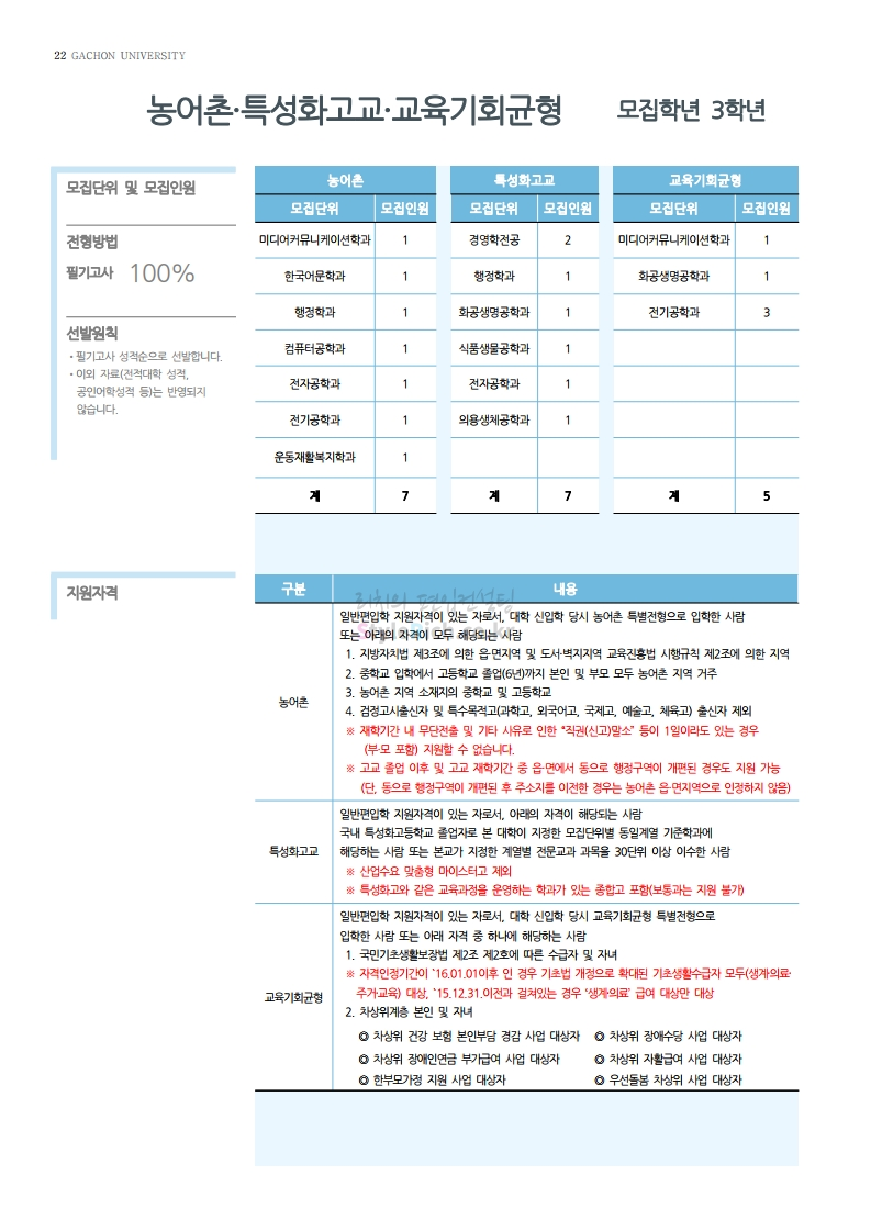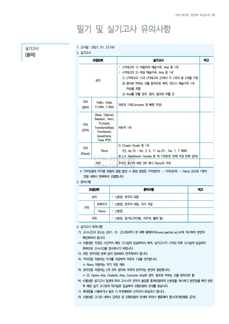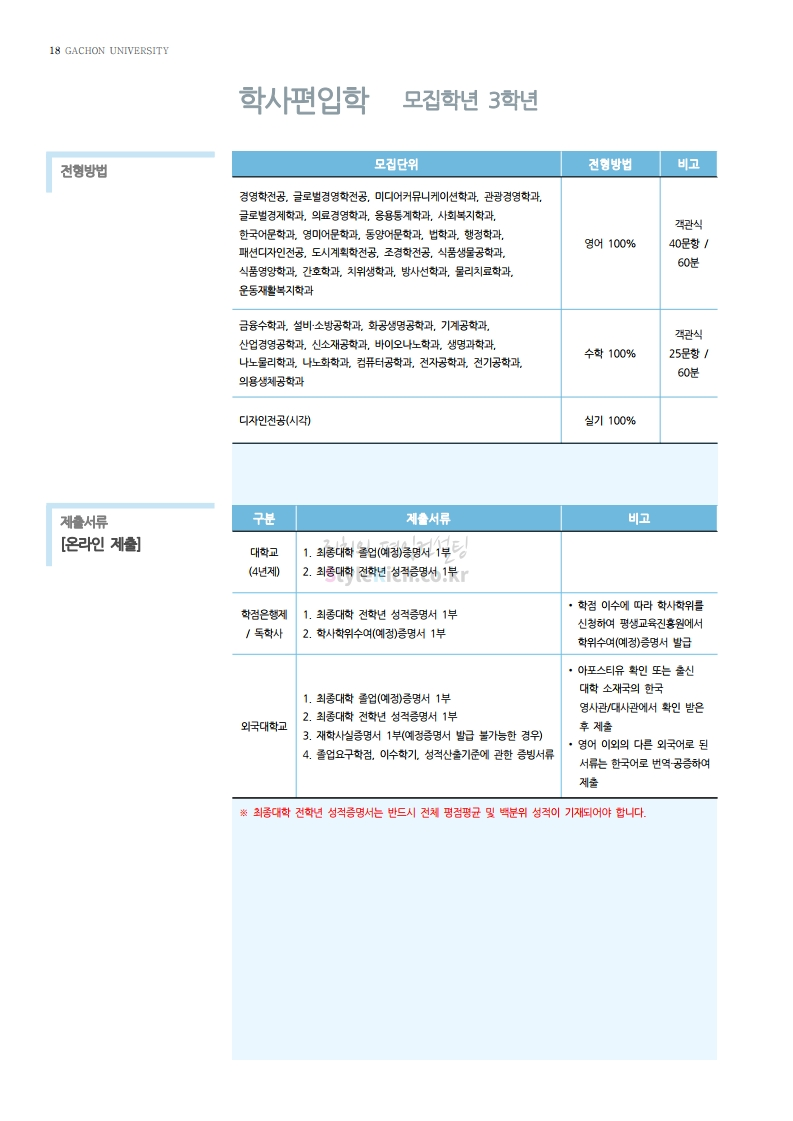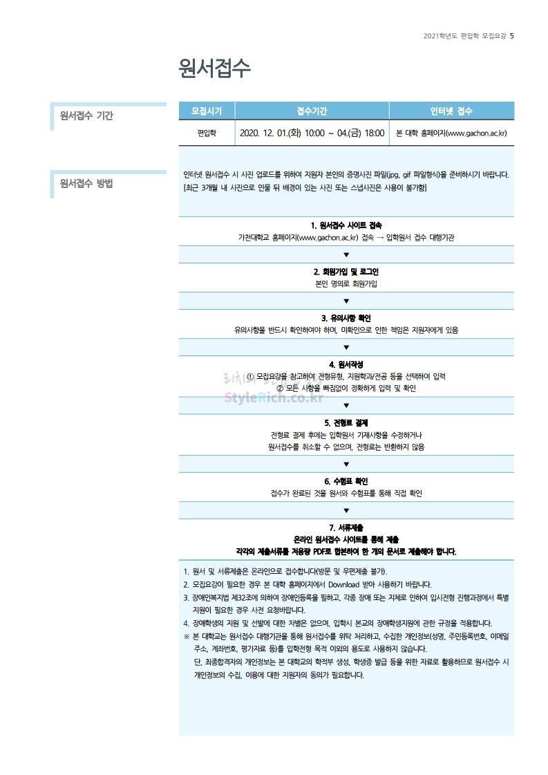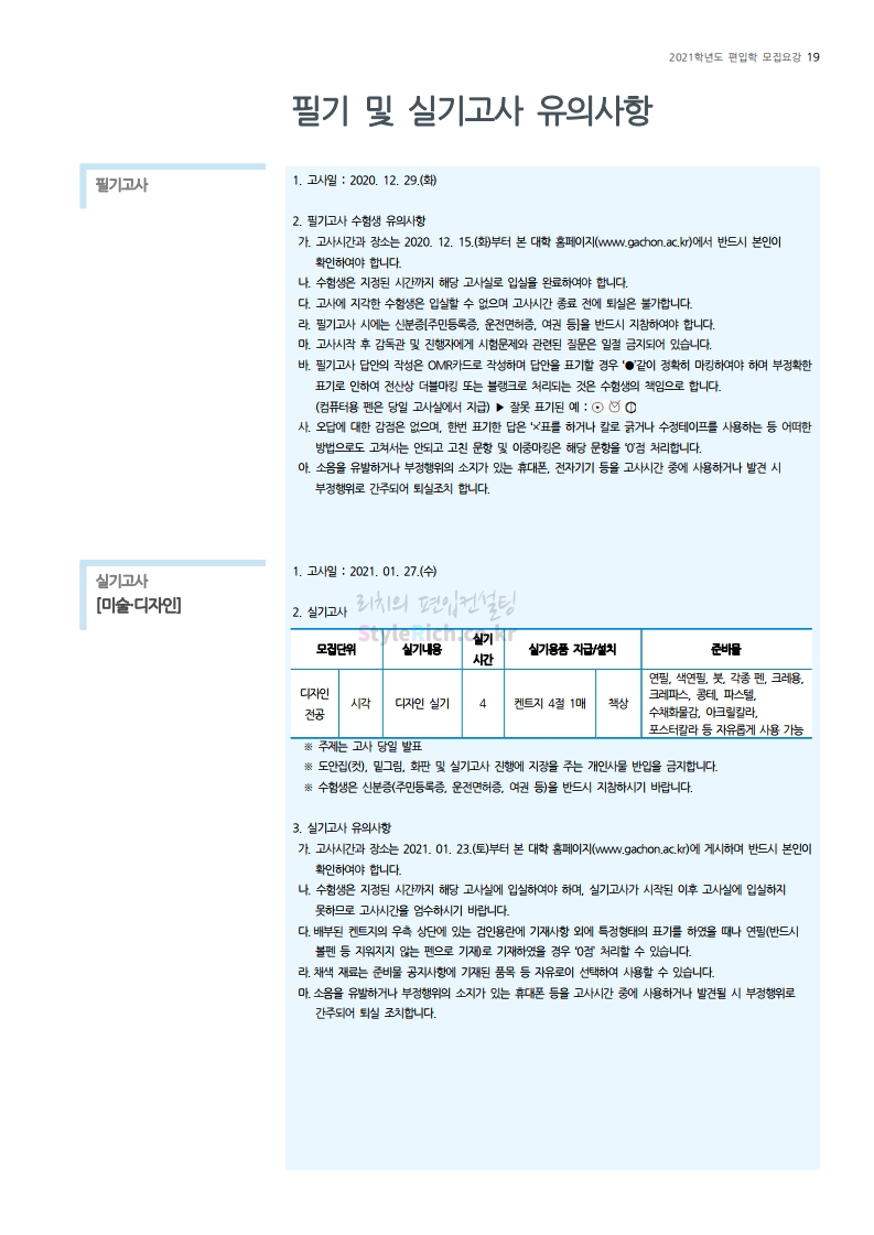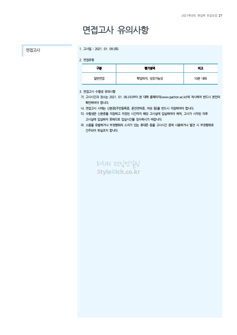 가천대 편입 2021학년도 모집요강 간편하게 보자! 2020.11.27 01:14 편입 모집요강/2021학년도 모집요강 2021학년도 가천대 편입 모집요강(2020.11.26 기준)을 간편하게 확인하세요. PC나 모바일에서 이미지를 클릭(터치) 후 이미지의 좌우측을 클릭(터치)하면 모집요강의 순서를 앞뒤로 넘길 수 있습니다. 좌측 클릭(터치)는 이전 페이지, 우측 클릭(터치)는 다음 페이지입니다. *최종 모집요강 발표 이후에도 내용의 일부가 변경될 수 있으니 지원 전 반드시 가천대 입학처의 모집요강을 확인 바랍니다. 2021학년도 가천대 편입 모집요강 다운받기 2021학년도+가천대학교+편입학+모집요강.pdf 0.58MB <출처: 가천대> KR탐색 건너뛰기9+ 0:29 / 7:42가천대학교 통학방법을 알아보자! 공유하기 게시글 관리 리치의 편입컨설팅 저작자표시 비영리 변경금지 (새창열림) '편입 모집요강 > 2021학년도 모집요강' 카테고리의 다른 글 한국항공대 편입 2021학년도 모집요강 간편하게 보자! (0) 2020.11.29 국민대 편입 2021학년도 모집요강 간편하게 보자! (0) 2020.11.29 서울대 편입 2021학년도 모집요강 간편하게 보자! (0) 2020.11.26 2021학년도 건국대 편입 전형변경이 갖는 의미는? (0) 2020.10.18 2021학년도 이화여대 편입 전형변경이 갖는 의미는? (0) 2020.10.03 댓글 공유하기 다른 글 댓글 이 글 공유하기 구독하기 구독하기 카카오톡 카카오톡 라인 라인 트위터 트위터 Facebook Facebook 카카오스토리 카카오스토리 밴드 밴드 네이버 블로그 네이버 블로그 Pocket Pocket Evernote Evernote 다른 글 한국항공대 편입 2021학년도 모집요강 간편하게 보자! 한국항공대 편입 2021학년도 모집요강 간편하게 보자! 2020.11.29 국민대 편입 2021학년도 모집요강 간편하게 보자! 국민대 편입 2021학년도 모집요강 간편하게 보자! 2020.11.29 서울대 편입 2021학년도 모집요강 간편하게 보자! 서울대 편입 2021학년도 모집요강 간편하게 보자! 2020.11.26 2021학년도 건국대 편입 전형변경이 갖는 의미는? 2021학년도 건국대 편입 전형변경이 갖는 의미는? 2020.10.18 다른 글 더 둘러보기