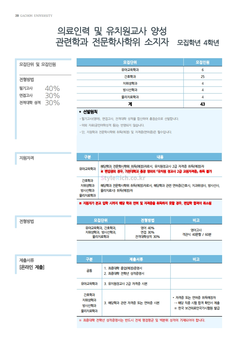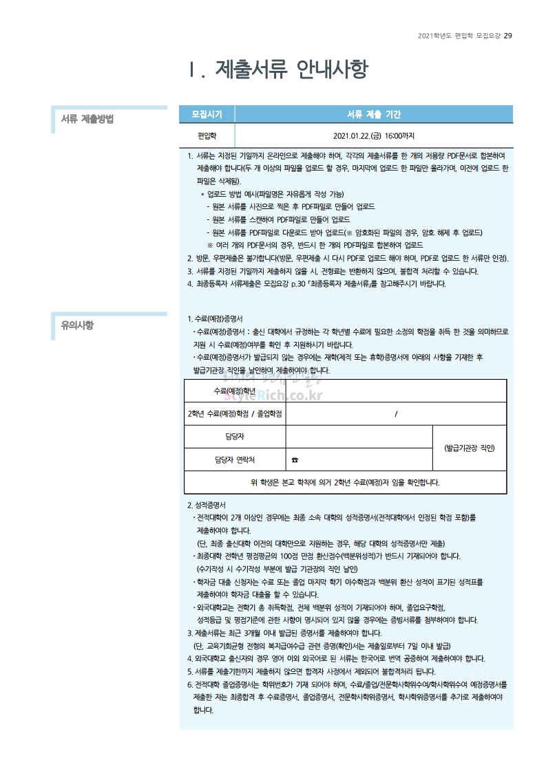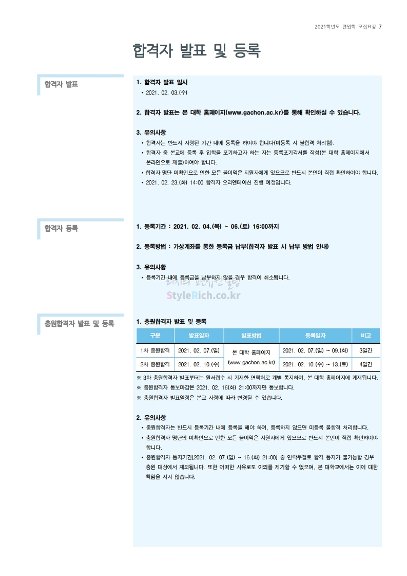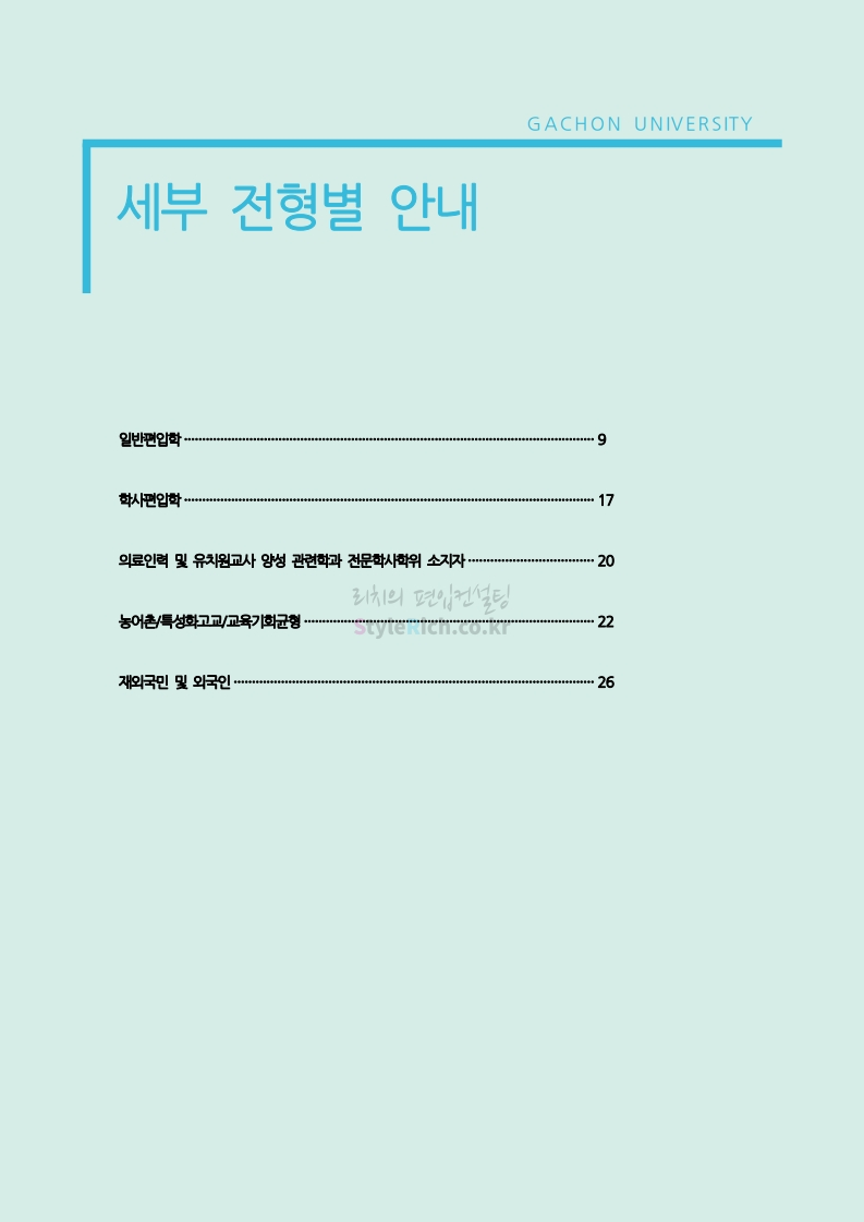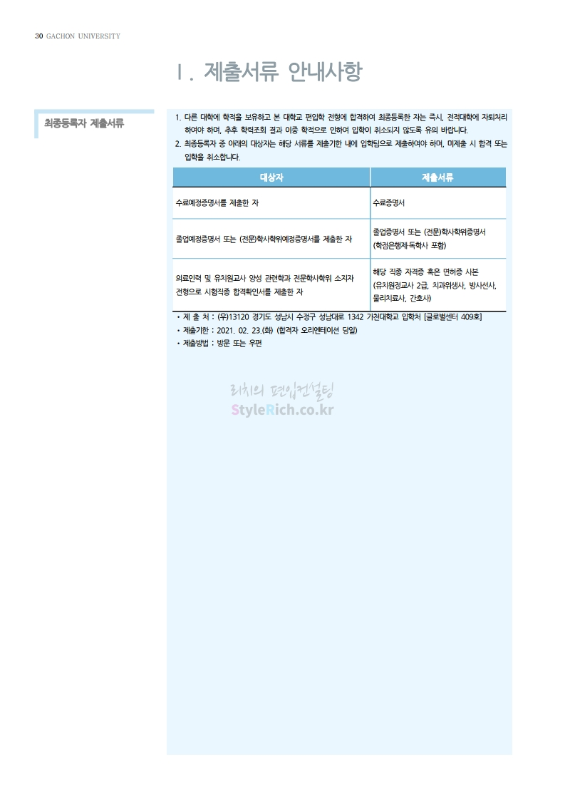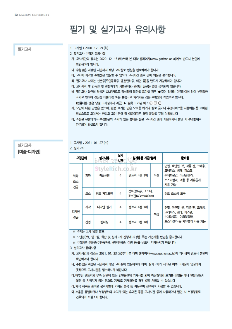 가천대 편입 2021학년도 모집요강 간편하게 보자! 2020.11.27 01:14 편입 모집요강/2021학년도 모집요강 2021학년도 가천대 편입 모집요강(2020.11.26 기준)을 간편하게 확인하세요. PC나 모바일에서 이미지를 클릭(터치) 후 이미지의 좌우측을 클릭(터치)하면 모집요강의 순서를 앞뒤로 넘길 수 있습니다. 좌측 클릭(터치)는 이전 페이지, 우측 클릭(터치)는 다음 페이지입니다. *최종 모집요강 발표 이후에도 내용의 일부가 변경될 수 있으니 지원 전 반드시 가천대 입학처의 모집요강을 확인 바랍니다. 2021학년도 가천대 편입 모집요강 다운받기 2021학년도+가천대학교+편입학+모집요강.pdf 0.58MB <출처: 가천대> KR탐색 건너뛰기9+ 0:29 / 7:42가천대학교 통학방법을 알아보자! 공유하기 게시글 관리 리치의 편입컨설팅 저작자표시 비영리 변경금지 (새창열림) '편입 모집요강 > 2021학년도 모집요강' 카테고리의 다른 글 한국항공대 편입 2021학년도 모집요강 간편하게 보자! (0) 2020.11.29 국민대 편입 2021학년도 모집요강 간편하게 보자! (0) 2020.11.29 서울대 편입 2021학년도 모집요강 간편하게 보자! (0) 2020.11.26 2021학년도 건국대 편입 전형변경이 갖는 의미는? (0) 2020.10.18 2021학년도 이화여대 편입 전형변경이 갖는 의미는? (0) 2020.10.03 댓글 공유하기 다른 글 댓글 이 글 공유하기 구독하기 구독하기 카카오톡 카카오톡 라인 라인 트위터 트위터 Facebook Facebook 카카오스토리 카카오스토리 밴드 밴드 네이버 블로그 네이버 블로그 Pocket Pocket Evernote Evernote 다른 글 한국항공대 편입 2021학년도 모집요강 간편하게 보자! 한국항공대 편입 2021학년도 모집요강 간편하게 보자! 2020.11.29 국민대 편입 2021학년도 모집요강 간편하게 보자! 국민대 편입 2021학년도 모집요강 간편하게 보자! 2020.11.29 서울대 편입 2021학년도 모집요강 간편하게 보자! 서울대 편입 2021학년도 모집요강 간편하게 보자! 2020.11.26 2021학년도 건국대 편입 전형변경이 갖는 의미는? 2021학년도 건국대 편입 전형변경이 갖는 의미는? 2020.10.18 다른 글 더 둘러보기