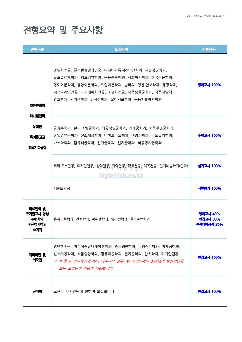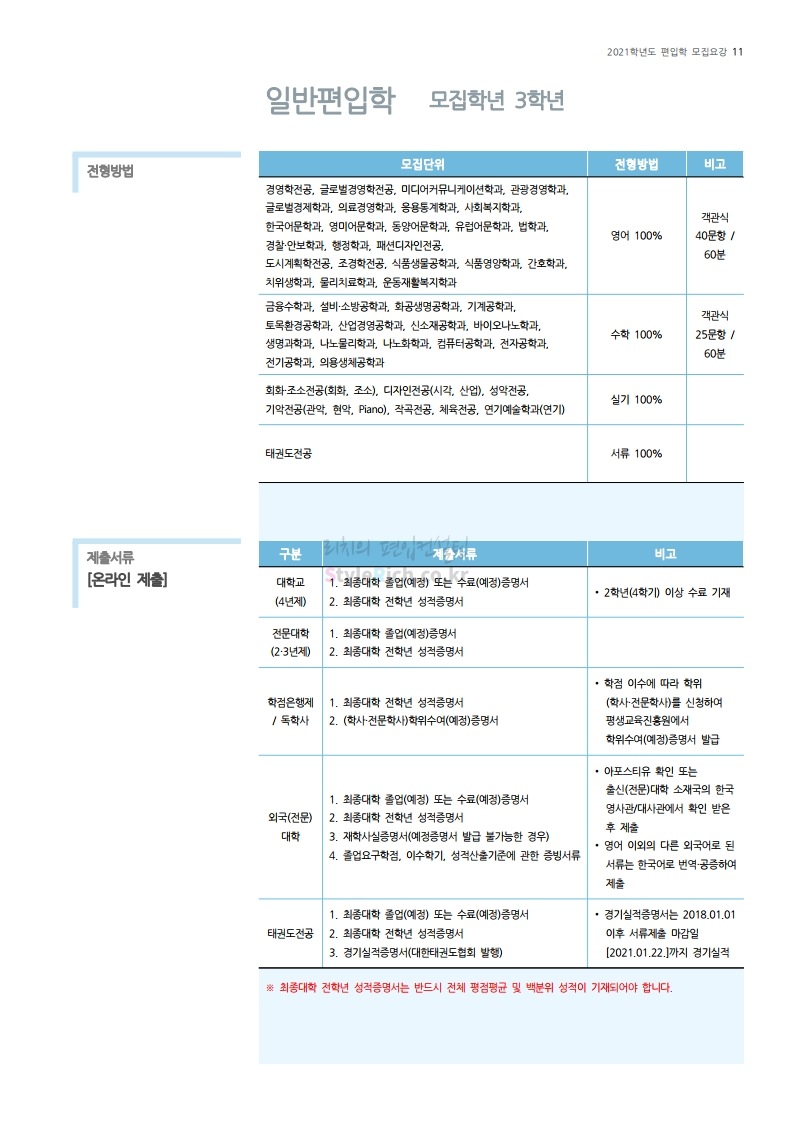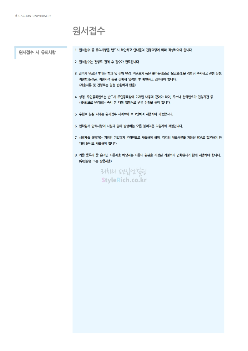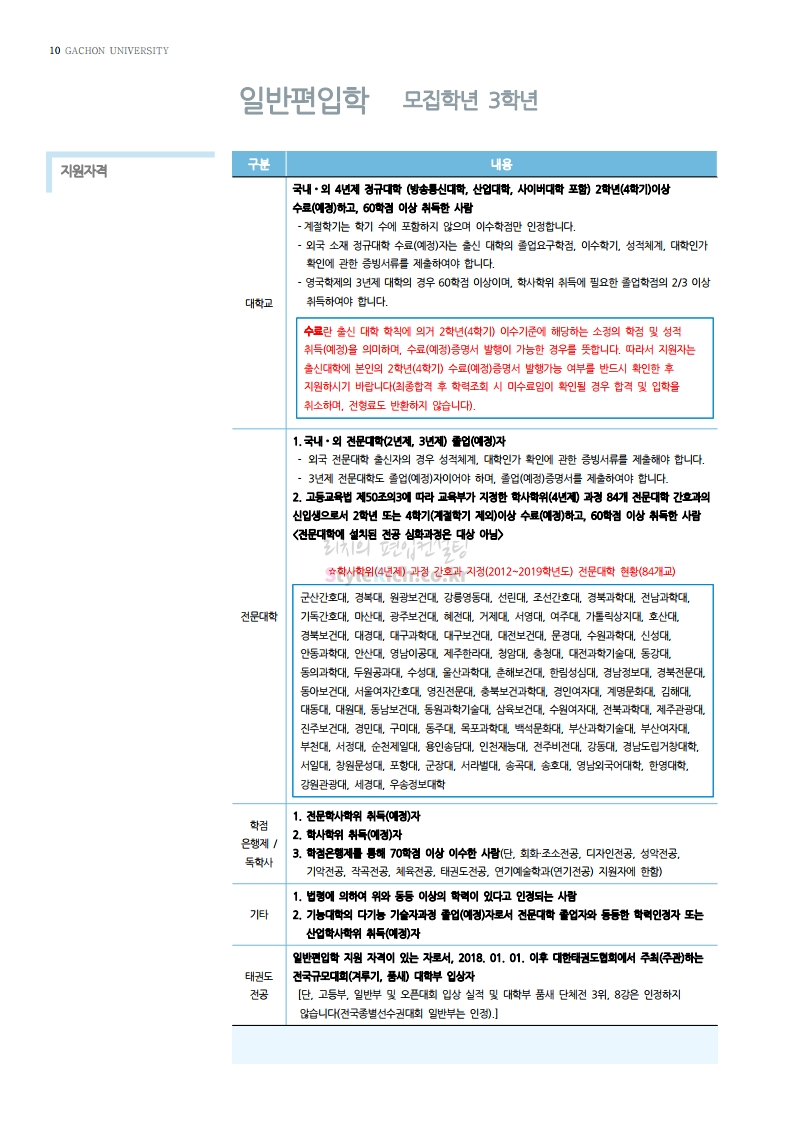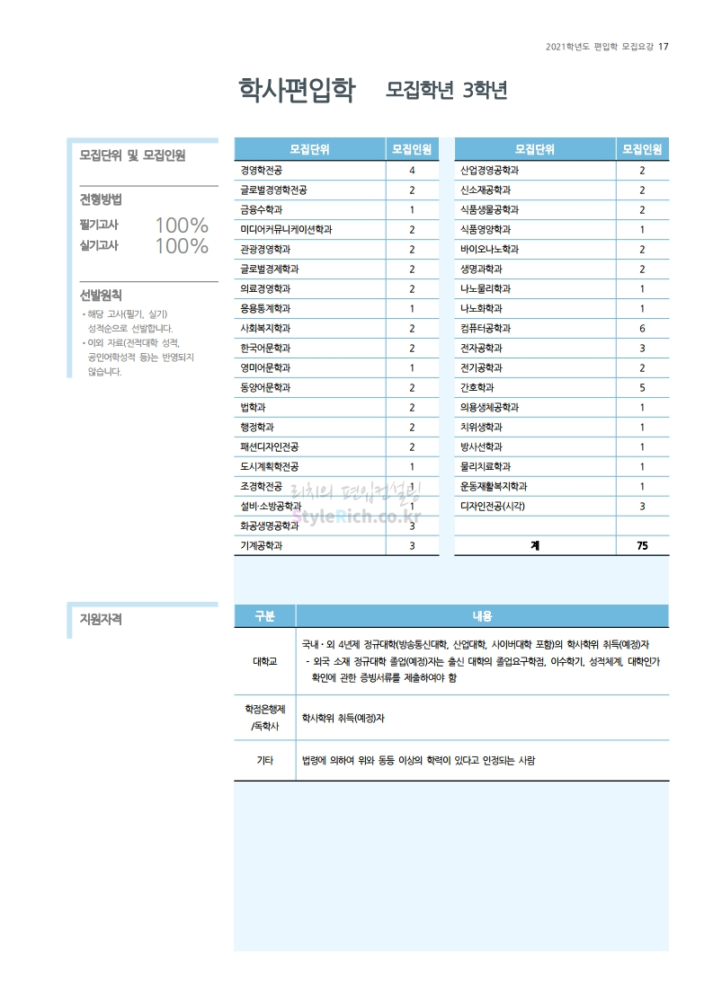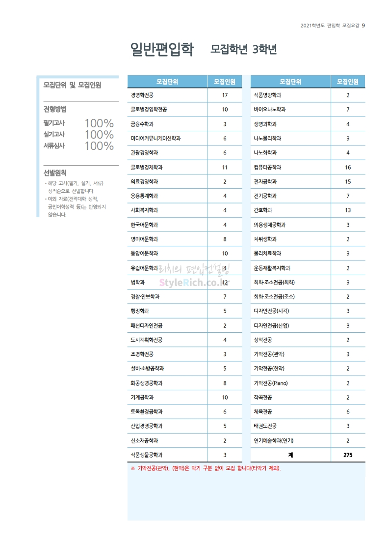 가천대 편입 2021학년도 모집요강 간편하게 보자! 2020.11.27 01:14 편입 모집요강/2021학년도 모집요강 2021학년도 가천대 편입 모집요강(2020.11.26 기준)을 간편하게 확인하세요. PC나 모바일에서 이미지를 클릭(터치) 후 이미지의 좌우측을 클릭(터치)하면 모집요강의 순서를 앞뒤로 넘길 수 있습니다. 좌측 클릭(터치)는 이전 페이지, 우측 클릭(터치)는 다음 페이지입니다. *최종 모집요강 발표 이후에도 내용의 일부가 변경될 수 있으니 지원 전 반드시 가천대 입학처의 모집요강을 확인 바랍니다. 2021학년도 가천대 편입 모집요강 다운받기 2021학년도+가천대학교+편입학+모집요강.pdf 0.58MB <출처: 가천대> KR탐색 건너뛰기9+ 0:29 / 7:42가천대학교 통학방법을 알아보자! 공유하기 게시글 관리 리치의 편입컨설팅 저작자표시 비영리 변경금지 (새창열림) '편입 모집요강 > 2021학년도 모집요강' 카테고리의 다른 글 한국항공대 편입 2021학년도 모집요강 간편하게 보자! (0) 2020.11.29 국민대 편입 2021학년도 모집요강 간편하게 보자! (0) 2020.11.29 서울대 편입 2021학년도 모집요강 간편하게 보자! (0) 2020.11.26 2021학년도 건국대 편입 전형변경이 갖는 의미는? (0) 2020.10.18 2021학년도 이화여대 편입 전형변경이 갖는 의미는? (0) 2020.10.03 댓글 공유하기 다른 글 댓글 이 글 공유하기 구독하기 구독하기 카카오톡 카카오톡 라인 라인 트위터 트위터 Facebook Facebook 카카오스토리 카카오스토리 밴드 밴드 네이버 블로그 네이버 블로그 Pocket Pocket Evernote Evernote 다른 글 한국항공대 편입 2021학년도 모집요강 간편하게 보자! 한국항공대 편입 2021학년도 모집요강 간편하게 보자! 2020.11.29 국민대 편입 2021학년도 모집요강 간편하게 보자! 국민대 편입 2021학년도 모집요강 간편하게 보자! 2020.11.29 서울대 편입 2021학년도 모집요강 간편하게 보자! 서울대 편입 2021학년도 모집요강 간편하게 보자! 2020.11.26 2021학년도 건국대 편입 전형변경이 갖는 의미는? 2021학년도 건국대 편입 전형변경이 갖는 의미는? 2020.10.18 다른 글 더 둘러보기