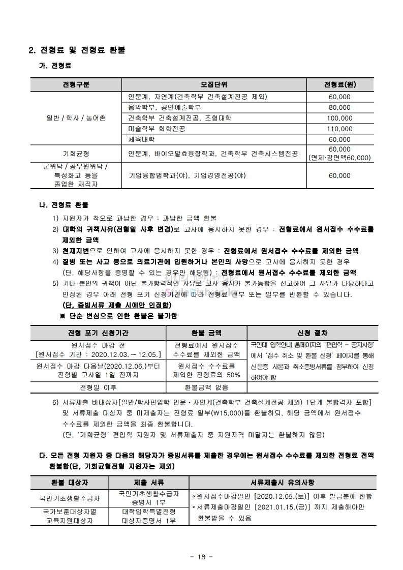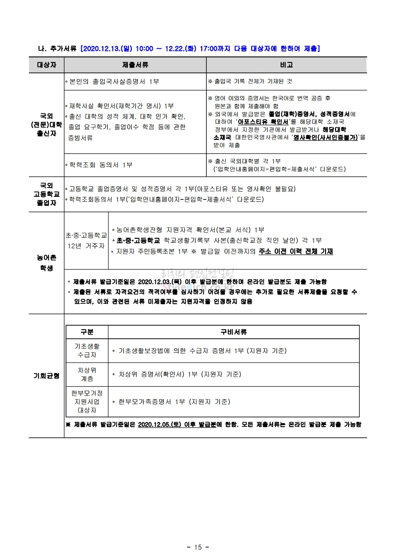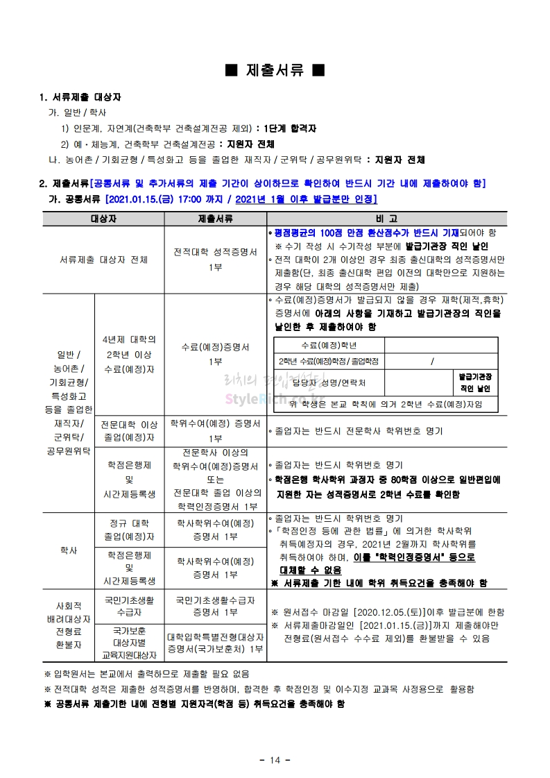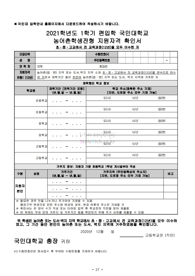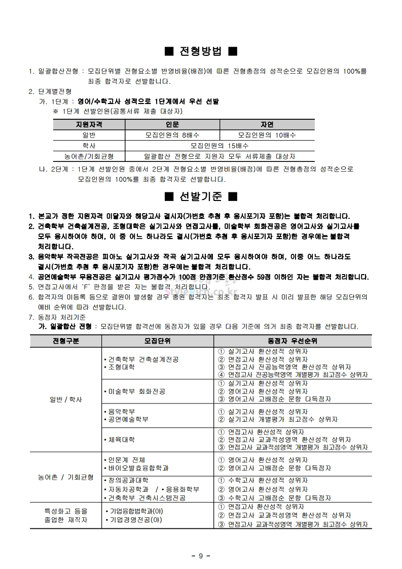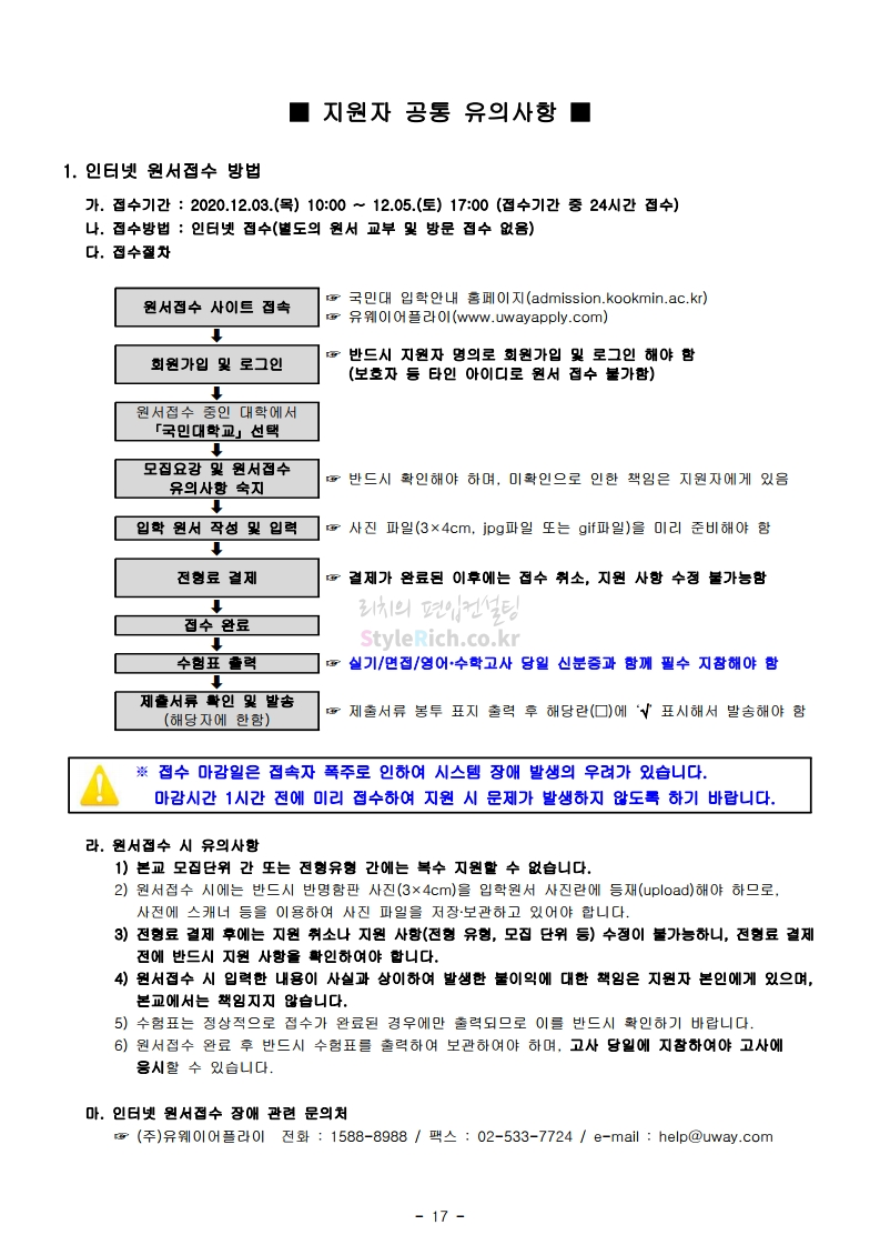 국민대 편입 2021학년도 모집요강 간편하게 보자! 2020.11.29 15:15 편입 모집요강/2021학년도 모집요강 2021학년도 국민대 편입 모집요강(2020.11.27 기준)을 간편하게 확인하세요. PC나 모바일에서 이미지를 클릭(터치) 후 이미지의 좌우측을 클릭(터치)하면 모집요강의 순서를 앞뒤로 넘길 수 있습니다. 좌측 클릭(터치)는 이전 페이지, 우측 클릭(터치)는 다음 페이지 입니다. * 최종 모집요강 발표 이후에도 내용의 일부가 변경될 수 있으니 지원 전 반드시 국민대 입학처의 모집요강을 확인 바랍니다. 2021학년도 국민대 편입 모집요강 다운받기 2021학년도_1학기_편입학_모집요강.pdf 0.43MB <출처: 국민대> 11월2일, 국민대 "차세대 통합정보시스템"이 찾아 온다 공유하기 게시글 관리 리치의 편입컨설팅 저작자표시 비영리 변경금지 (새창열림) '편입 모집요강 > 2021학년도 모집요강' 카테고리의 다른 글 단국대(천안) 편입 2021학년도 모집요강 간편하게 보자! (0) 2020.12.02 한국항공대 편입 2021학년도 모집요강 간편하게 보자! (0) 2020.11.29 가천대 편입 2021학년도 모집요강 간편하게 보자! (0) 2020.11.27 서울대 편입 2021학년도 모집요강 간편하게 보자! (0) 2020.11.26 2021학년도 건국대 편입 전형변경이 갖는 의미는? (0) 2020.10.18 댓글 공유하기 다른 글 댓글 이 글 공유하기 구독하기 구독하기 카카오톡 카카오톡 라인 라인 트위터 트위터 Facebook Facebook 카카오스토리 카카오스토리 밴드 밴드 네이버 블로그 네이버 블로그 Pocket Pocket Evernote Evernote 다른 글 단국대(천안) 편입 2021학년도 모집요강 간편하게 보자! 단국대(천안) 편입 2021학년도 모집요강 간편하게 보자! 2020.12.02 한국항공대 편입 2021학년도 모집요강 간편하게 보자! 한국항공대 편입 2021학년도 모집요강 간편하게 보자! 2020.11.29 가천대 편입 2021학년도 모집요강 간편하게 보자! 가천대 편입 2021학년도 모집요강 간편하게 보자! 2020.11.27 서울대 편입 2021학년도 모집요강 간편하게 보자! 서울대 편입 2021학년도 모집요강 간편하게 보자! 2020.11.26 다른 글 더 둘러보기