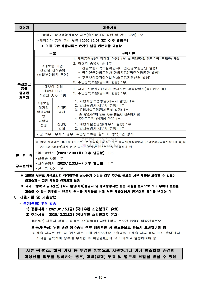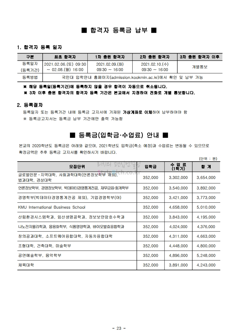 국민대 편입 2021학년도 모집요강 간편하게 보자! 2020.11.29 15:15 편입 모집요강/2021학년도 모집요강 2021학년도 국민대 편입 모집요강(2020.11.27 기준)을 간편하게 확인하세요. PC나 모바일에서 이미지를 클릭(터치) 후 이미지의 좌우측을 클릭(터치)하면 모집요강의 순서를 앞뒤로 넘길 수 있습니다. 좌측 클릭(터치)는 이전 페이지, 우측 클릭(터치)는 다음 페이지 입니다. * 최종 모집요강 발표 이후에도 내용의 일부가 변경될 수 있으니 지원 전 반드시 국민대 입학처의 모집요강을 확인 바랍니다. 2021학년도 국민대 편입 모집요강 다운받기 2021학년도_1학기_편입학_모집요강.pdf 0.43MB <출처: 국민대> 11월2일, 국민대 "차세대 통합정보시스템"이 찾아 온다 공유하기 게시글 관리 리치의 편입컨설팅 저작자표시 비영리 변경금지 (새창열림) '편입 모집요강 > 2021학년도 모집요강' 카테고리의 다른 글 단국대(천안) 편입 2021학년도 모집요강 간편하게 보자! (0) 2020.12.02 한국항공대 편입 2021학년도 모집요강 간편하게 보자! (0) 2020.11.29 가천대 편입 2021학년도 모집요강 간편하게 보자! (0) 2020.11.27 서울대 편입 2021학년도 모집요강 간편하게 보자! (0) 2020.11.26 2021학년도 건국대 편입 전형변경이 갖는 의미는? (0) 2020.10.18 댓글 공유하기 다른 글 댓글 이 글 공유하기 구독하기 구독하기 카카오톡 카카오톡 라인 라인 트위터 트위터 Facebook Facebook 카카오스토리 카카오스토리 밴드 밴드 네이버 블로그 네이버 블로그 Pocket Pocket Evernote Evernote 다른 글 단국대(천안) 편입 2021학년도 모집요강 간편하게 보자! 단국대(천안) 편입 2021학년도 모집요강 간편하게 보자! 2020.12.02 한국항공대 편입 2021학년도 모집요강 간편하게 보자! 한국항공대 편입 2021학년도 모집요강 간편하게 보자! 2020.11.29 가천대 편입 2021학년도 모집요강 간편하게 보자! 가천대 편입 2021학년도 모집요강 간편하게 보자! 2020.11.27 서울대 편입 2021학년도 모집요강 간편하게 보자! 서울대 편입 2021학년도 모집요강 간편하게 보자! 2020.11.26 다른 글 더 둘러보기