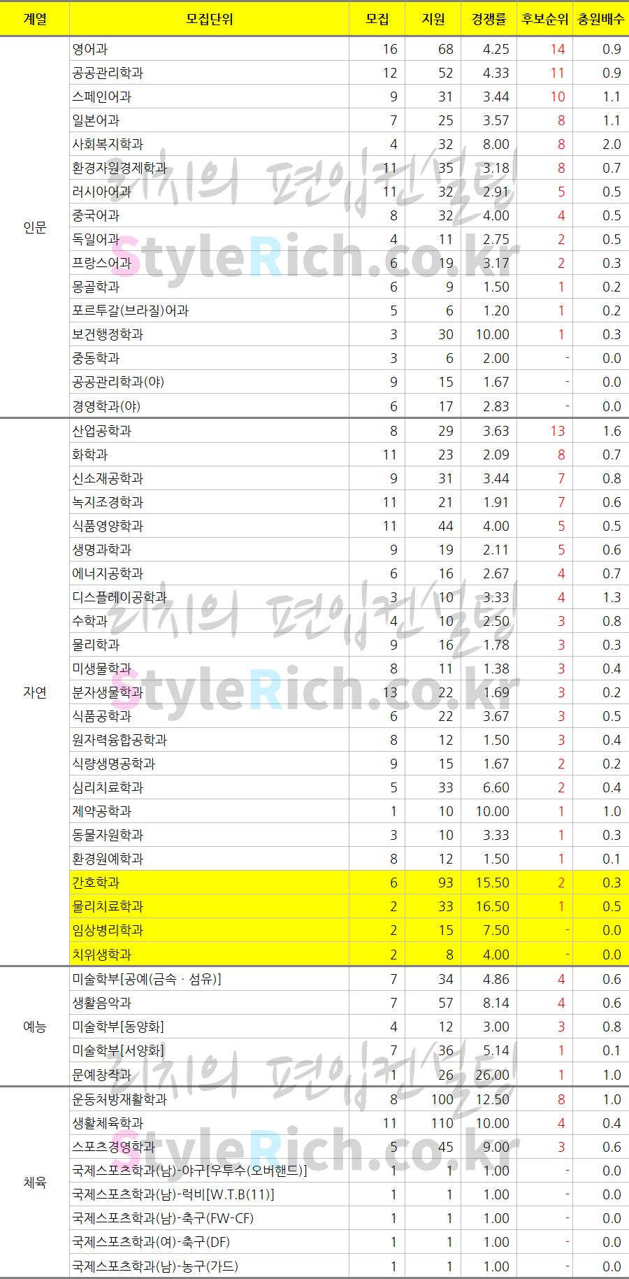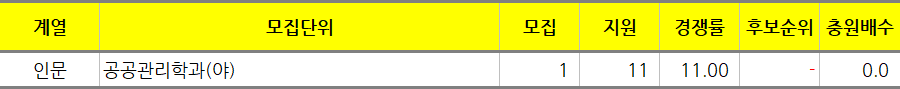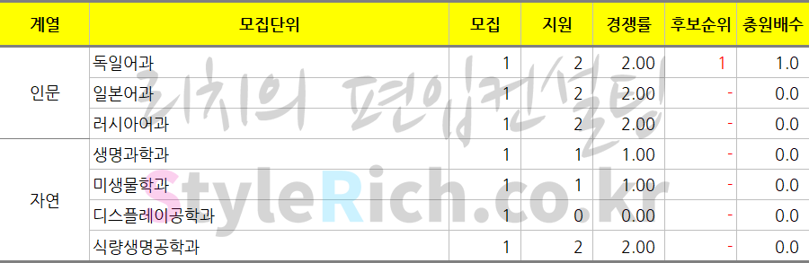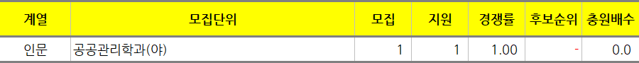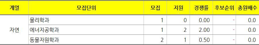 딱 모집인원만큼만 지원한 학과는 인문의 프랑스어과, 중동학과, 포르투갈(브라질)어과, 공공관리학과(야), 자연의 제약공학과, 원자력융합공학과, 동물자원학과, 환경원예학과이고 미달된 학과는 자연의 수학과입니다.