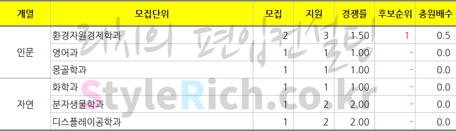 모집인원만큼 지원한 학과는 인문의 영어과, 몽골학과이고 자연의 화학과입니다.