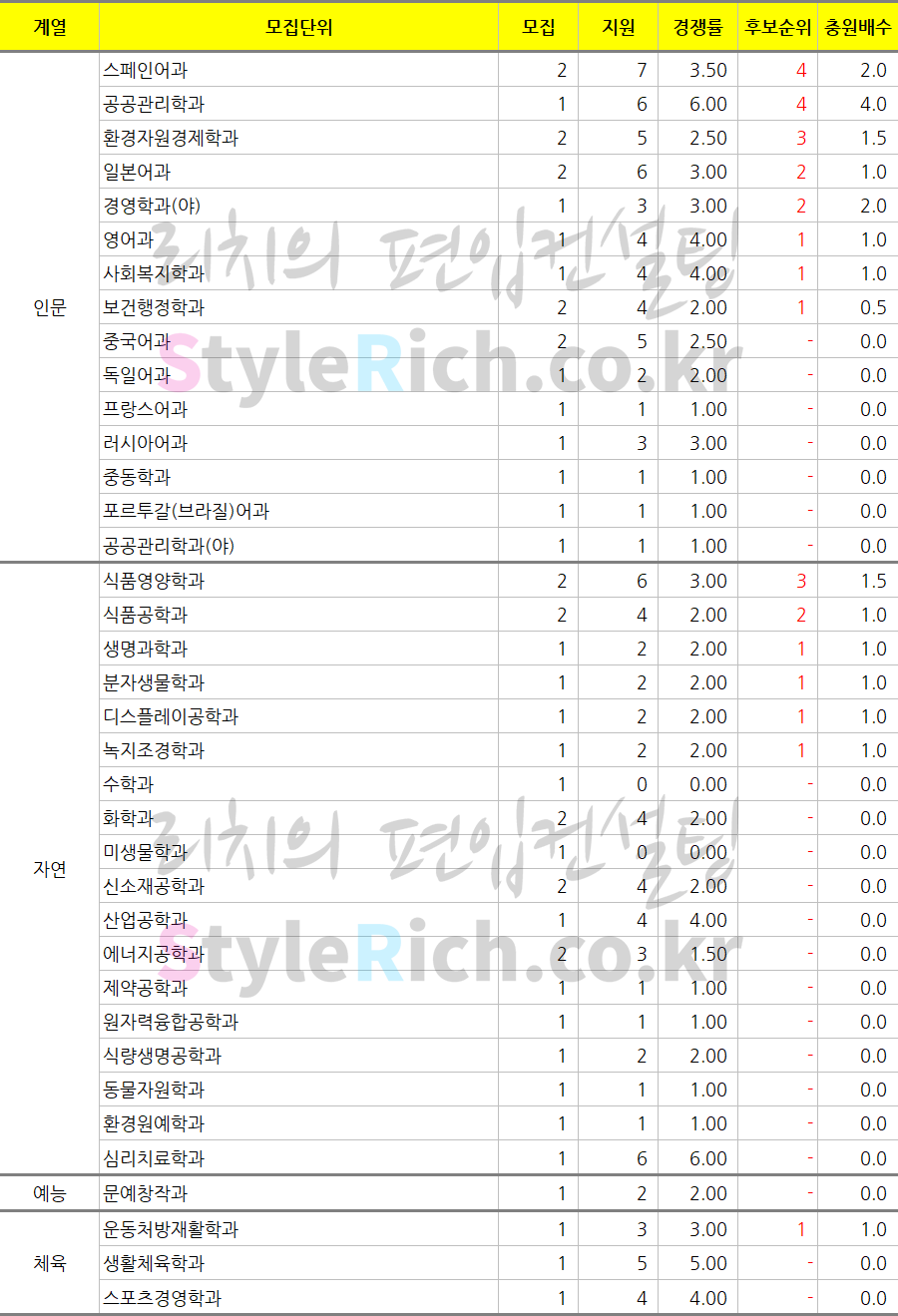 딱 모집인원만큼만 지원한 학과는 인문의 프랑스어과, 중동학과, 포르투갈(브라질)어과, 공공관리학과(야), 자연의 제약공학과, 원자력융합공학과, 동물자원학과, 환경원예학과이고 미달된 학과는 자연의 수학과입니다.