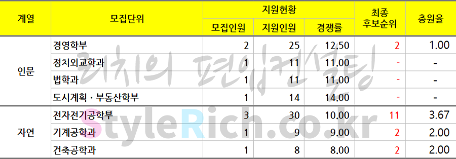 학사 추가합격 TOP3 학과: 전자전기공학부, 소프트웨어학과, 화학공학과