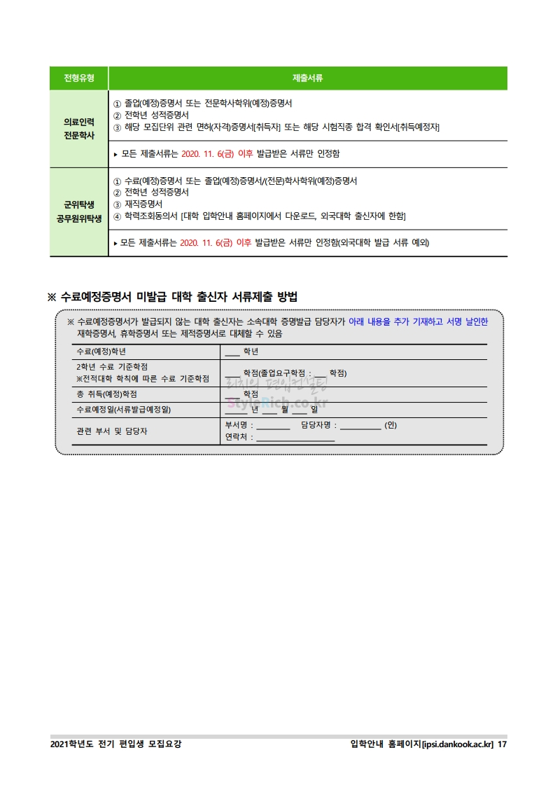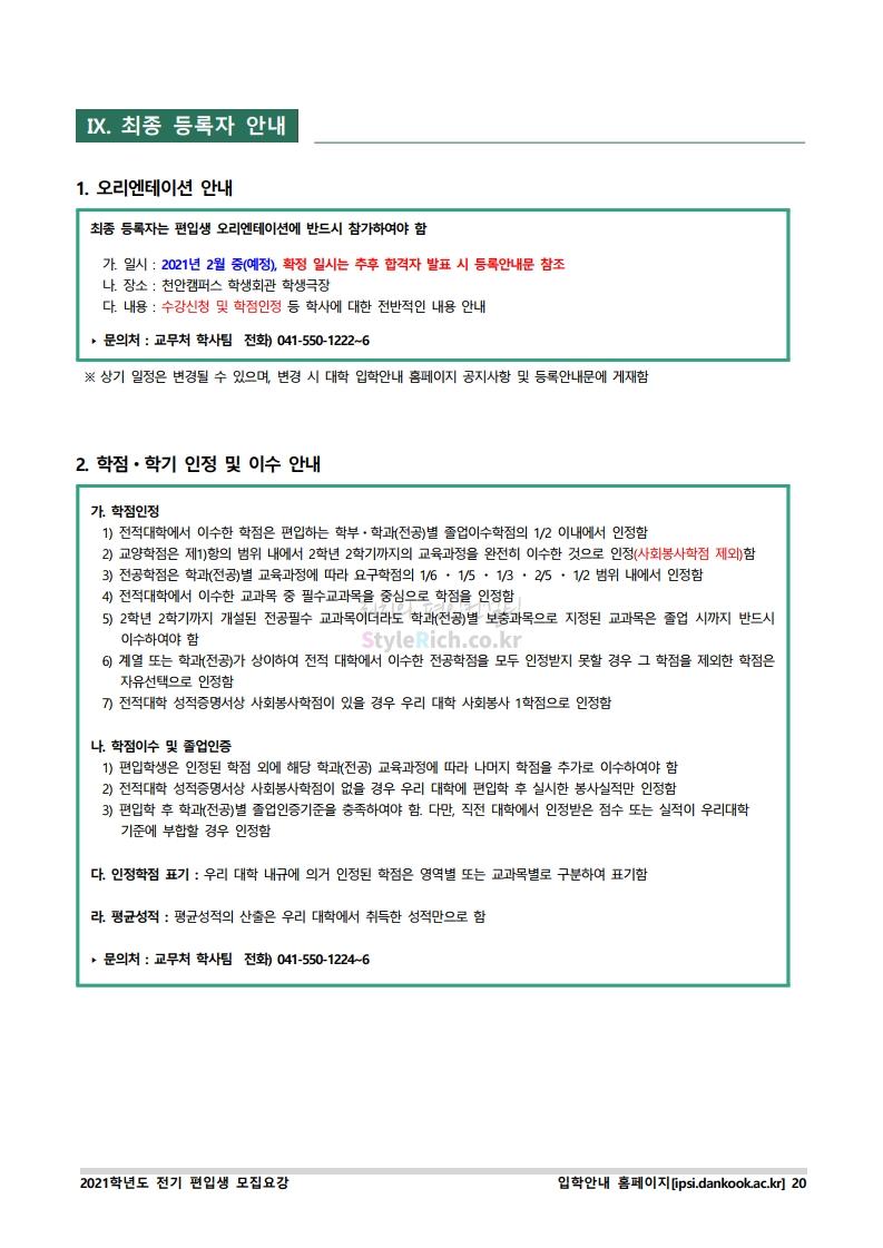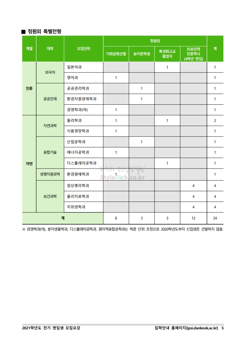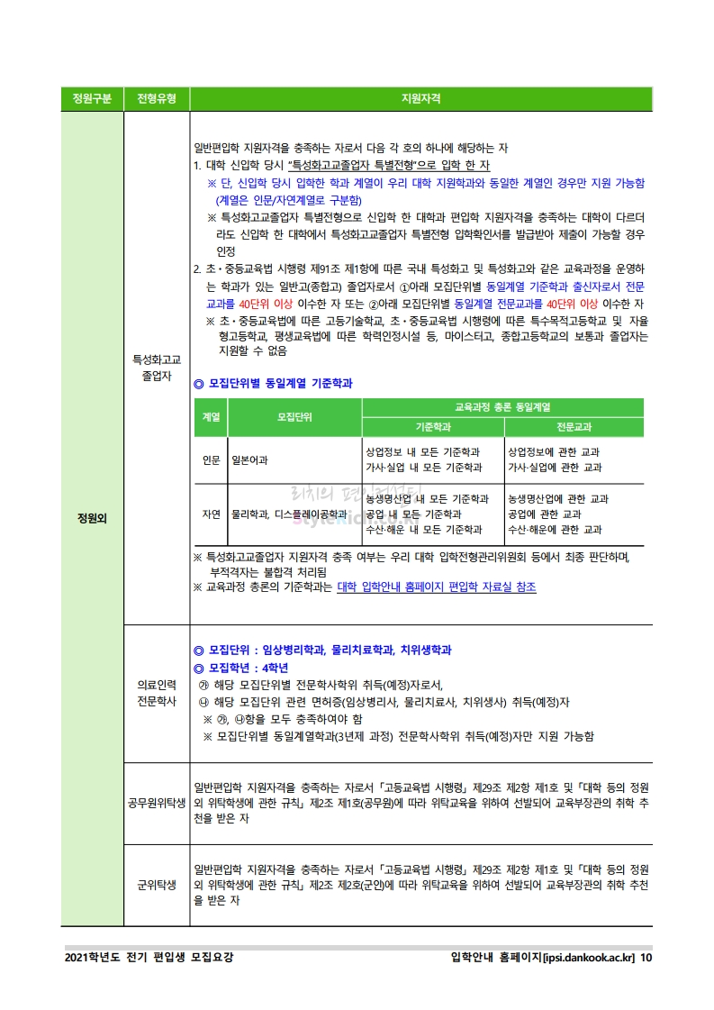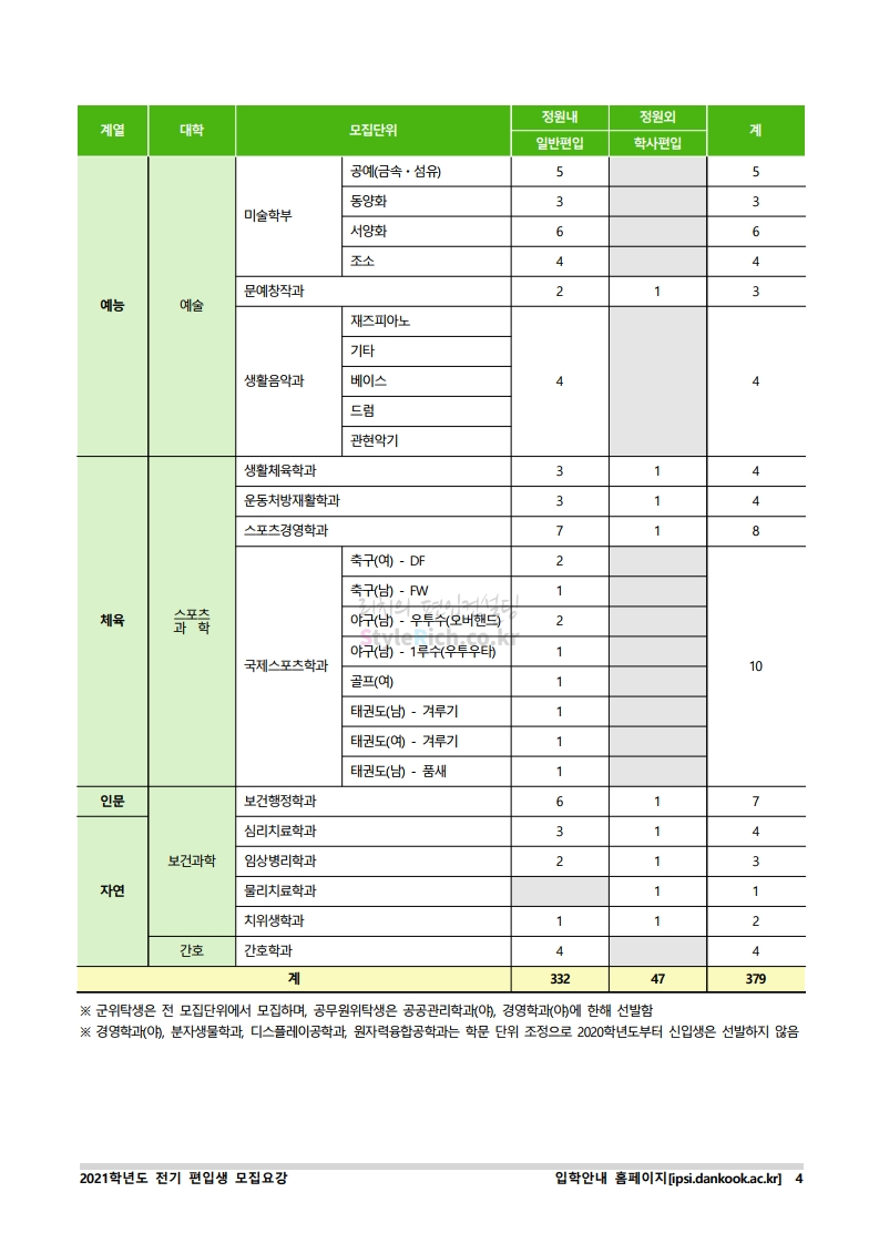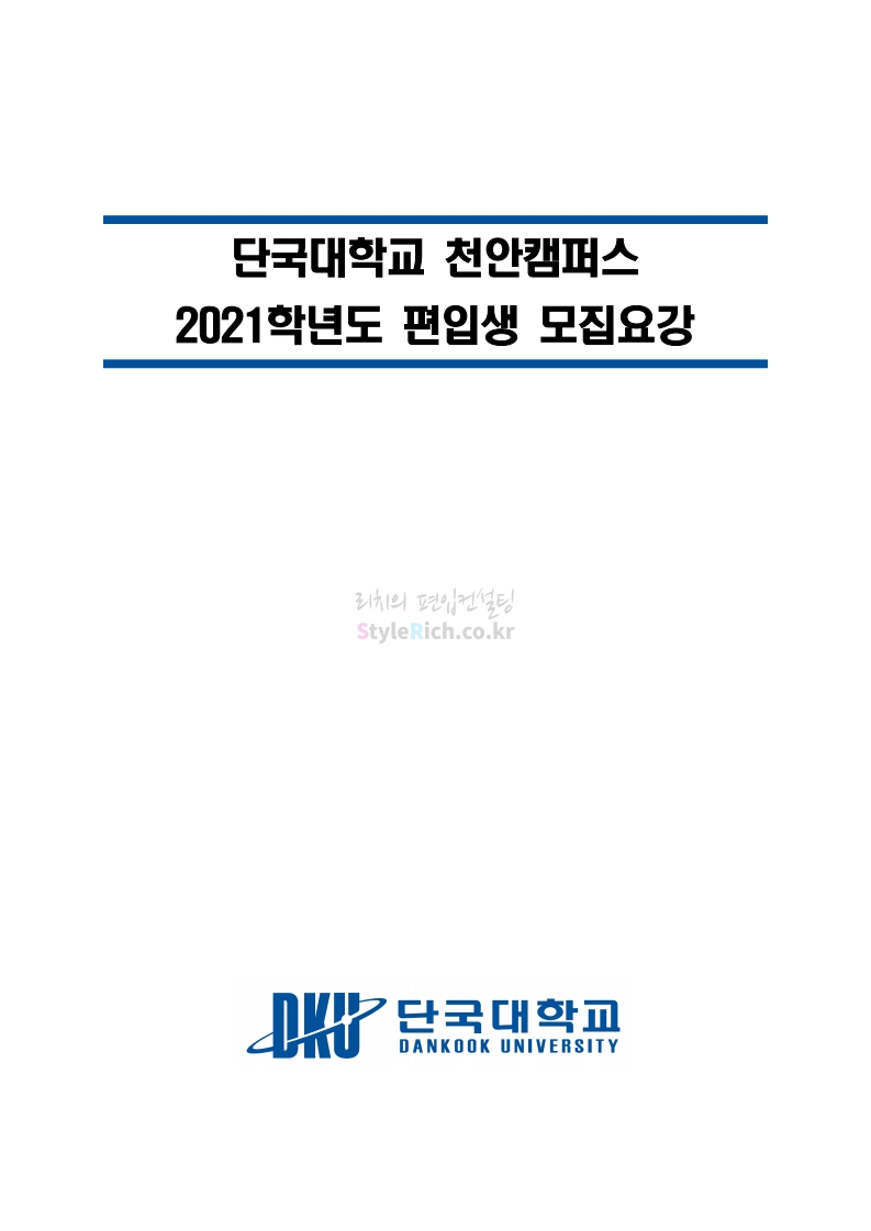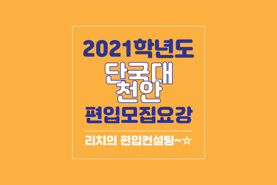 단국대(천안) 편입 2021학년도 모집요강 간편하게 보자! 2020.12.02 22:44 편입 모집요강/2021학년도 모집요강 2021학년도 단국대(천안) 편입 모집요강(2020.11.30 기준)을 간편하게 확인하세요. PC나 모바일에서 이미지를 클릭(터치) 후 이미지의 좌우측을 클릭(터치)하면 모집요강의 순서를 앞뒤로 넘길 수 있습니다. 좌측 클릭(터치)는 이전 페이지, 우측 클릭(터치)는 다음 페이지입니다. * 최종 모집요강 발표 이후에도 내용의 일부가 변경될 수 있으니 지원 전 반드시 단국대(천안) 입학처의 모집요강을 확인바랍니다. 2021학년도 단국대(천안) 모집요강 다운받기 [천안캠퍼스]2021학년도 편입생 모집요강.pdf 0.93MB <출처: 단국대> 단꿀 라이브 9회 : 천안캠퍼스 특집!!! 공유하기 게시글 관리 리치의 편입컨설팅 저작자표시 비영리 변경금지 (새창열림) '편입 모집요강 > 2021학년도 모집요강' 카테고리의 다른 글 건국대 편입 2021학년도 모집요강 간편하게 보자! (0) 2020.12.02 단국대(죽전) 편입 2021학년도 모집요강 간편하게 보자! (0) 2020.12.02 한국항공대 편입 2021학년도 모집요강 간편하게 보자! (0) 2020.11.29 국민대 편입 2021학년도 모집요강 간편하게 보자! (0) 2020.11.29 가천대 편입 2021학년도 모집요강 간편하게 보자! (0) 2020.11.27 댓글 공유하기 다른 글 댓글 이 글 공유하기 구독하기 구독하기 카카오톡 카카오톡 라인 라인 트위터 트위터 Facebook Facebook 카카오스토리 카카오스토리 밴드 밴드 네이버 블로그 네이버 블로그 Pocket Pocket Evernote Evernote 다른 글 건국대 편입 2021학년도 모집요강 간편하게 보자! 건국대 편입 2021학년도 모집요강 간편하게 보자! 2020.12.02 단국대(죽전) 편입 2021학년도 모집요강 간편하게 보자! 단국대(죽전) 편입 2021학년도 모집요강 간편하게 보자! 2020.12.02 한국항공대 편입 2021학년도 모집요강 간편하게 보자! 한국항공대 편입 2021학년도 모집요강 간편하게 보자! 2020.11.29 국민대 편입 2021학년도 모집요강 간편하게 보자! 국민대 편입 2021학년도 모집요강 간편하게 보자! 2020.11.29 다른 글 더 둘러보기