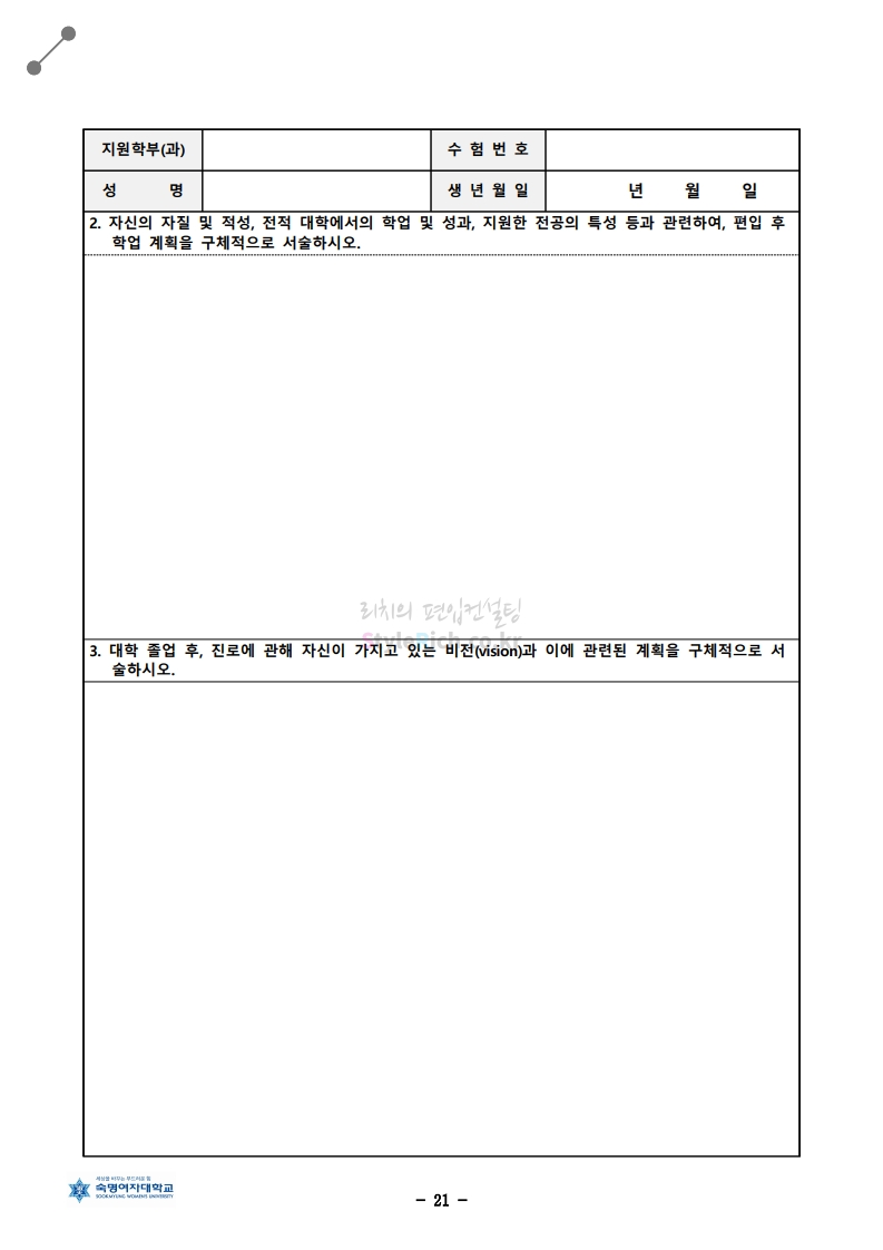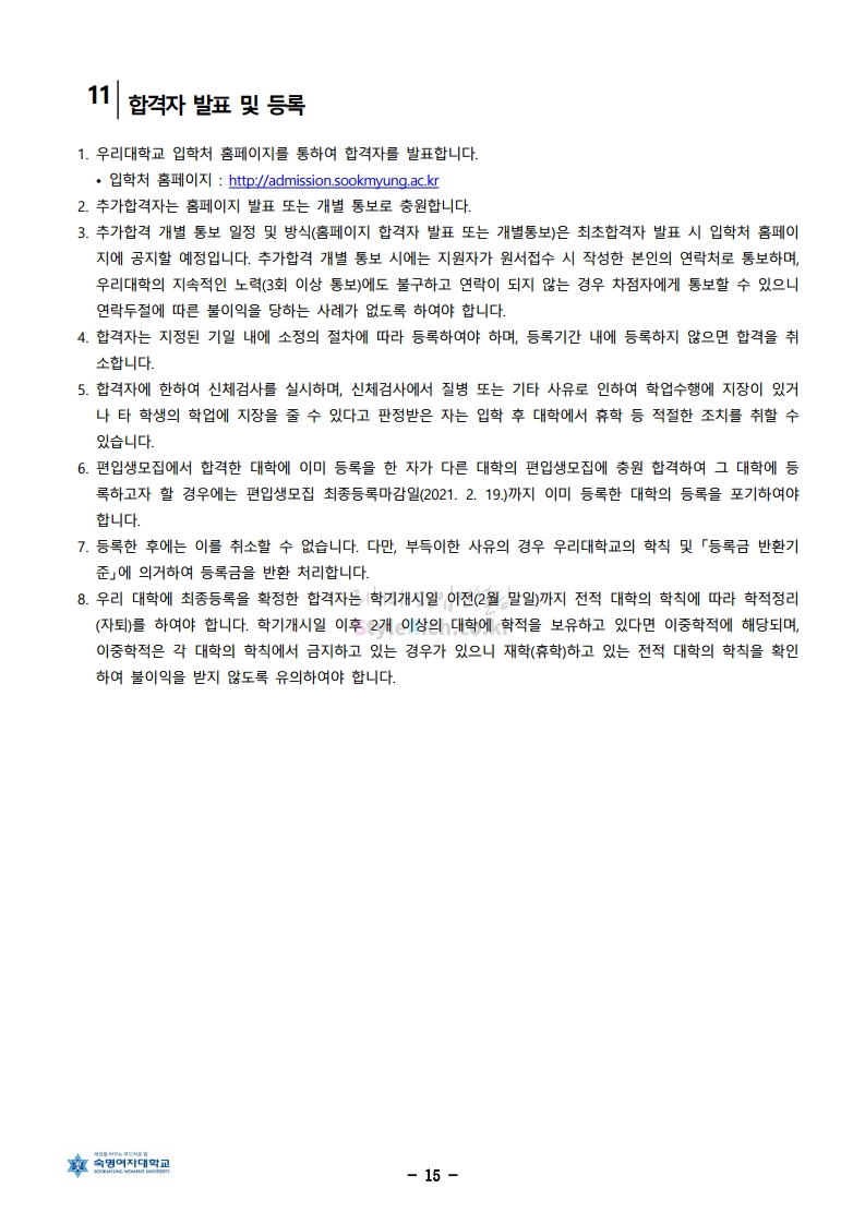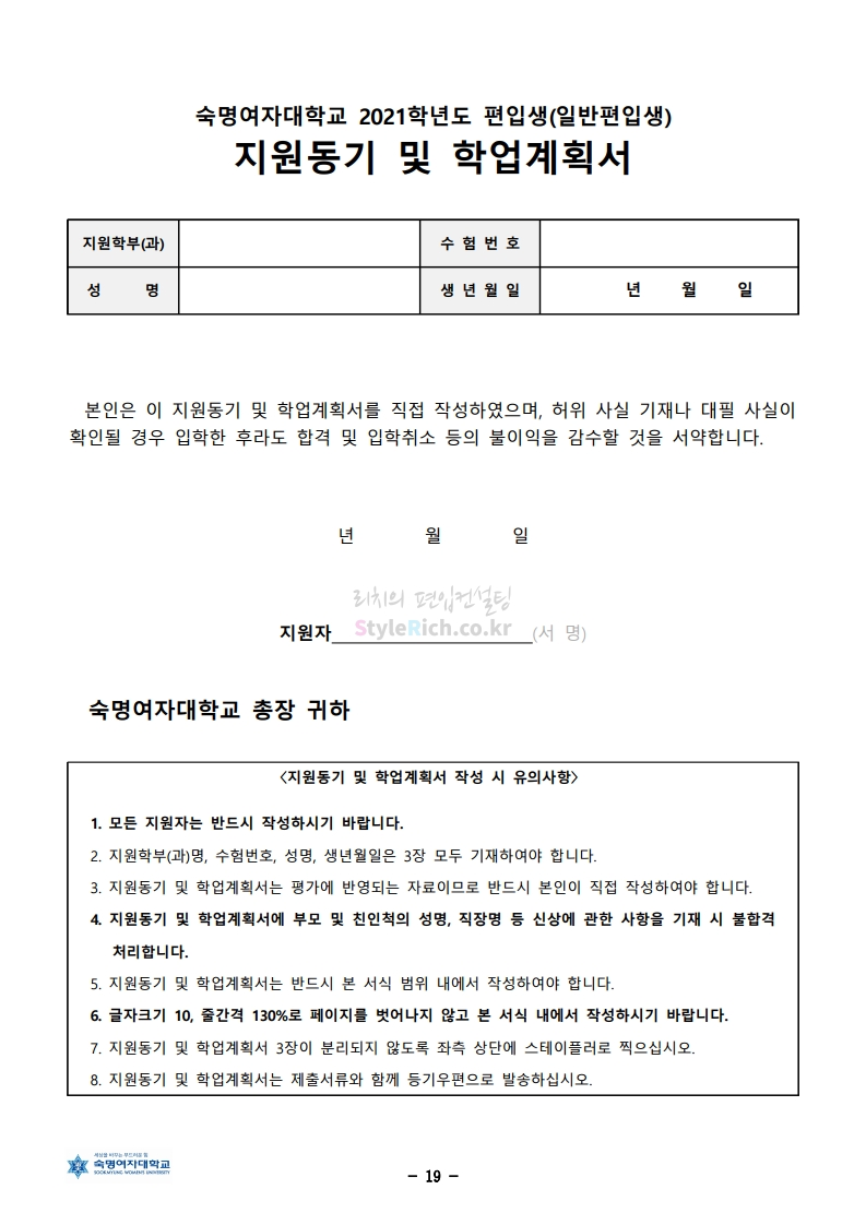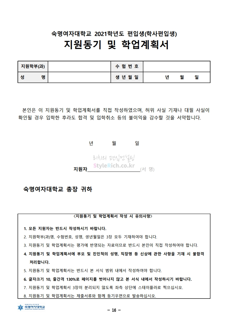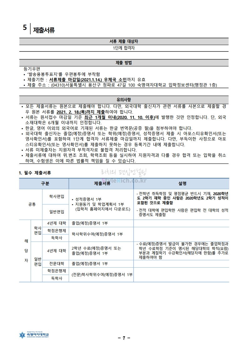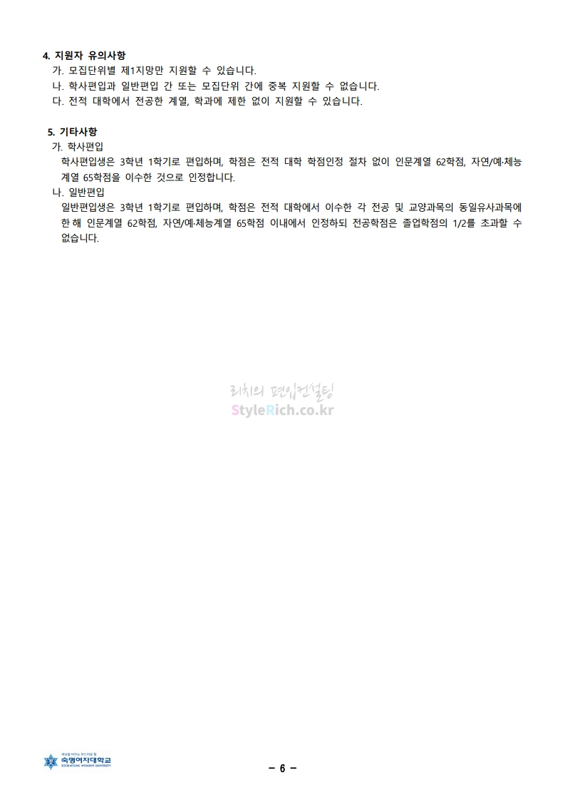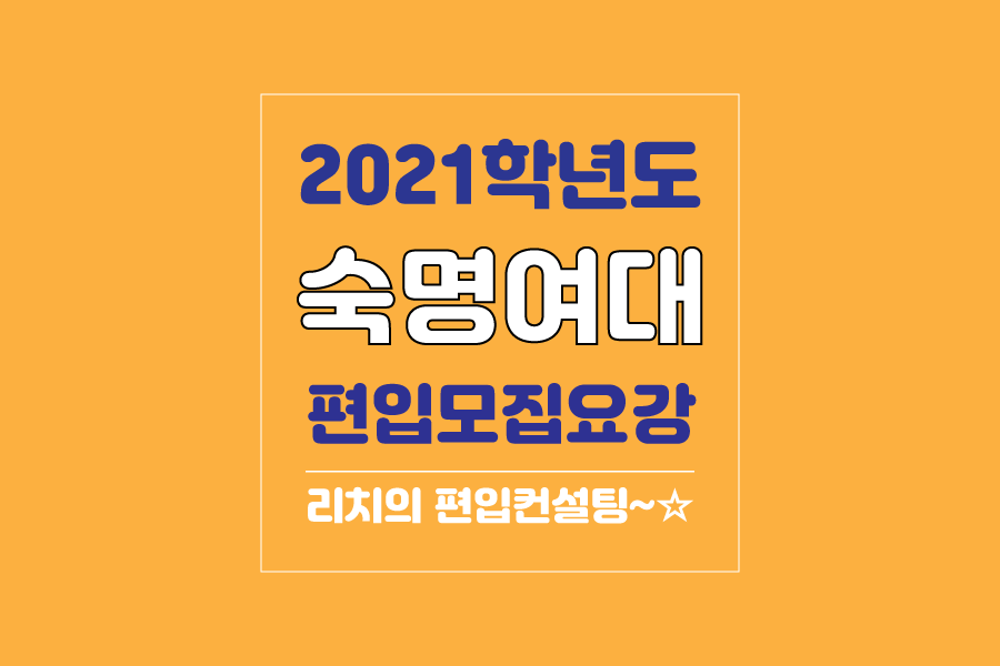 숙명여대 편입 2021학년도 모집요강 간편하게 보자! 2020.12.03 00:56 편입 모집요강/2021학년도 모집요강 2021학년도 숙명여대 편입 모집요강(2020.12.01 기준)을 간편하게 확인하세요. PC나 모바일에서 이미지를 클릭(터치) 후 이미지의 좌우측을 클릭(터치)하면 모집요강의 순서를 앞뒤로 넘길 수 있습니다. 좌측 클릭(터치)는 이전 페이지, 우측 클릭(터치)는 다음 페이지입니다. * 최종 모집요강 발표 이후에도 내용의 일부가 변경될 수 있으니 지원 전 반드시 숙명여대 입학처의 모집요강을 확인바랍니다. 2021학년도 숙명여대 편입 모집요강 다운받기 2021학년도_편입생모집요강.hwp 3.63MB <출처: 숙명여대> [캠퍼스투어 1편] 상상부기가 울고있다🥺 무슨일이야⁉ 공유하기 게시글 관리 리치의 편입컨설팅 저작자표시 비영리 변경금지 (새창열림) '편입 모집요강 > 2021학년도 모집요강' 카테고리의 다른 글 연세대 편입 2021학년도 모집요강 간편하게 보자! (0) 2020.12.05 연세대(미래) 편입 2021학년도 모집요강 간편하게 보자! (0) 2020.12.04 경희대 편입 2021학년도 모집요강 간편하게 보자! (0) 2020.12.03 건국대 편입 2021학년도 모집요강 간편하게 보자! (0) 2020.12.02 단국대(죽전) 편입 2021학년도 모집요강 간편하게 보자! (0) 2020.12.02 댓글 공유하기 다른 글 댓글 이 글 공유하기 구독하기 구독하기 카카오톡 카카오톡 라인 라인 트위터 트위터 Facebook Facebook 카카오스토리 카카오스토리 밴드 밴드 네이버 블로그 네이버 블로그 Pocket Pocket Evernote Evernote 다른 글 연세대 편입 2021학년도 모집요강 간편하게 보자! 연세대 편입 2021학년도 모집요강 간편하게 보자! 2020.12.05 연세대(미래) 편입 2021학년도 모집요강 간편하게 보자! 연세대(미래) 편입 2021학년도 모집요강 간편하게 보자! 2020.12.04 경희대 편입 2021학년도 모집요강 간편하게 보자! 경희대 편입 2021학년도 모집요강 간편하게 보자! 2020.12.03 건국대 편입 2021학년도 모집요강 간편하게 보자! 건국대 편입 2021학년도 모집요강 간편하게 보자! 2020.12.02 다른 글 더 둘러보기