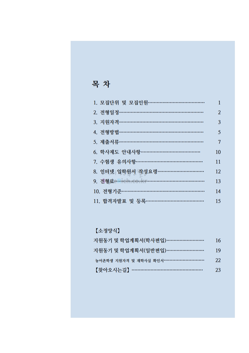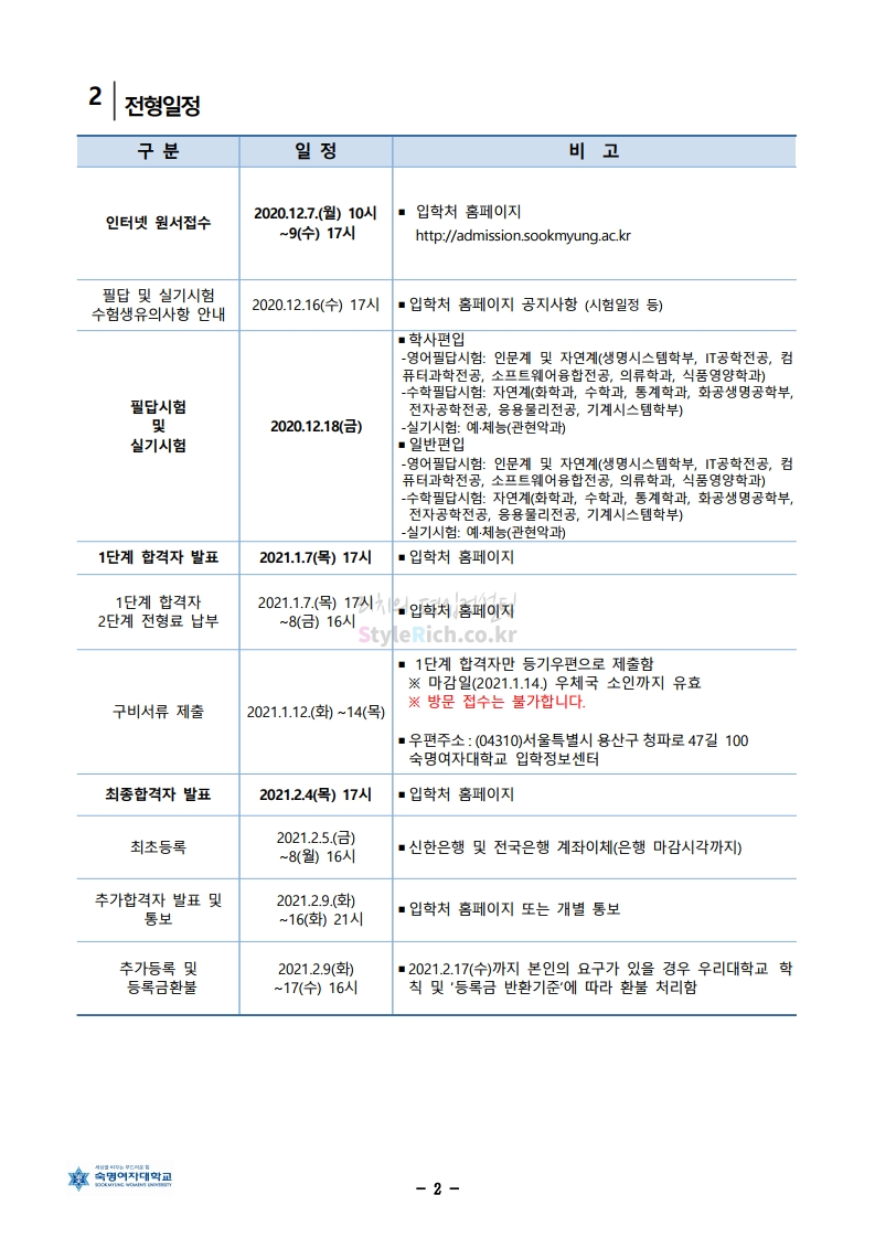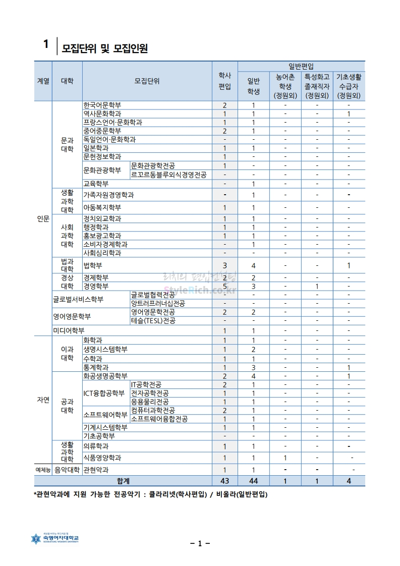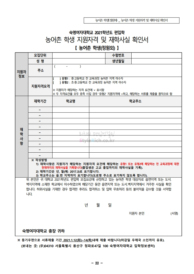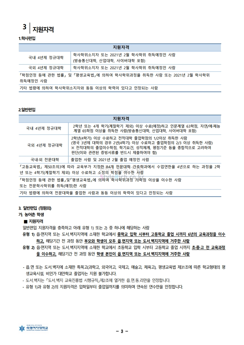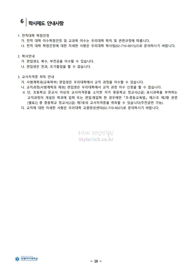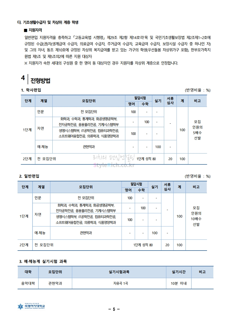 숙명여대 편입 2021학년도 모집요강 간편하게 보자! 2020.12.03 00:56 편입 모집요강/2021학년도 모집요강 2021학년도 숙명여대 편입 모집요강(2020.12.01 기준)을 간편하게 확인하세요. PC나 모바일에서 이미지를 클릭(터치) 후 이미지의 좌우측을 클릭(터치)하면 모집요강의 순서를 앞뒤로 넘길 수 있습니다. 좌측 클릭(터치)는 이전 페이지, 우측 클릭(터치)는 다음 페이지입니다. * 최종 모집요강 발표 이후에도 내용의 일부가 변경될 수 있으니 지원 전 반드시 숙명여대 입학처의 모집요강을 확인바랍니다. 2021학년도 숙명여대 편입 모집요강 다운받기 2021학년도_편입생모집요강.hwp 3.63MB <출처: 숙명여대> [캠퍼스투어 1편] 상상부기가 울고있다🥺 무슨일이야⁉ 공유하기 게시글 관리 리치의 편입컨설팅 저작자표시 비영리 변경금지 (새창열림) '편입 모집요강 > 2021학년도 모집요강' 카테고리의 다른 글 연세대 편입 2021학년도 모집요강 간편하게 보자! (0) 2020.12.05 연세대(미래) 편입 2021학년도 모집요강 간편하게 보자! (0) 2020.12.04 경희대 편입 2021학년도 모집요강 간편하게 보자! (0) 2020.12.03 건국대 편입 2021학년도 모집요강 간편하게 보자! (0) 2020.12.02 단국대(죽전) 편입 2021학년도 모집요강 간편하게 보자! (0) 2020.12.02 댓글 공유하기 다른 글 댓글 이 글 공유하기 구독하기 구독하기 카카오톡 카카오톡 라인 라인 트위터 트위터 Facebook Facebook 카카오스토리 카카오스토리 밴드 밴드 네이버 블로그 네이버 블로그 Pocket Pocket Evernote Evernote 다른 글 연세대 편입 2021학년도 모집요강 간편하게 보자! 연세대 편입 2021학년도 모집요강 간편하게 보자! 2020.12.05 연세대(미래) 편입 2021학년도 모집요강 간편하게 보자! 연세대(미래) 편입 2021학년도 모집요강 간편하게 보자! 2020.12.04 경희대 편입 2021학년도 모집요강 간편하게 보자! 경희대 편입 2021학년도 모집요강 간편하게 보자! 2020.12.03 건국대 편입 2021학년도 모집요강 간편하게 보자! 건국대 편입 2021학년도 모집요강 간편하게 보자! 2020.12.02 다른 글 더 둘러보기