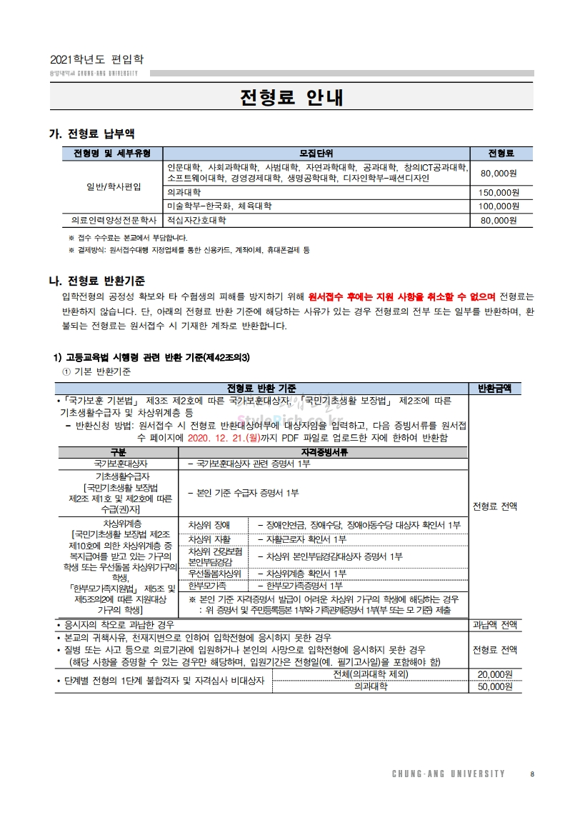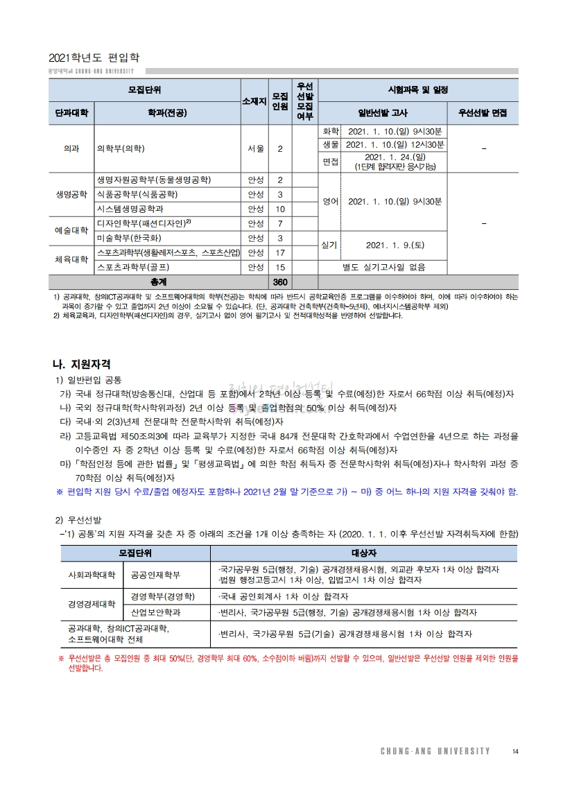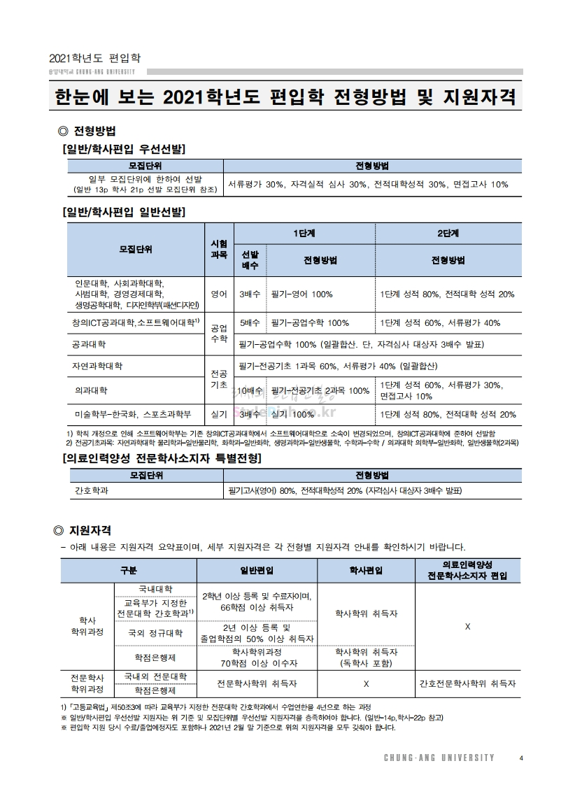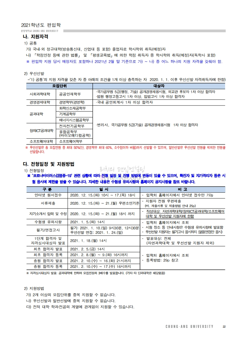 2021학년도 중앙대 편입 모집요강(2020.12.03 기준)을 간편하게 확인하세요.