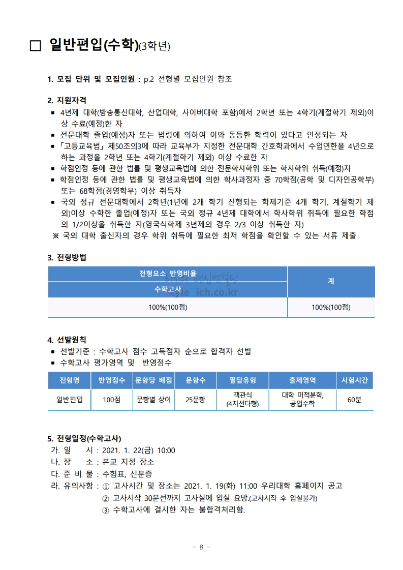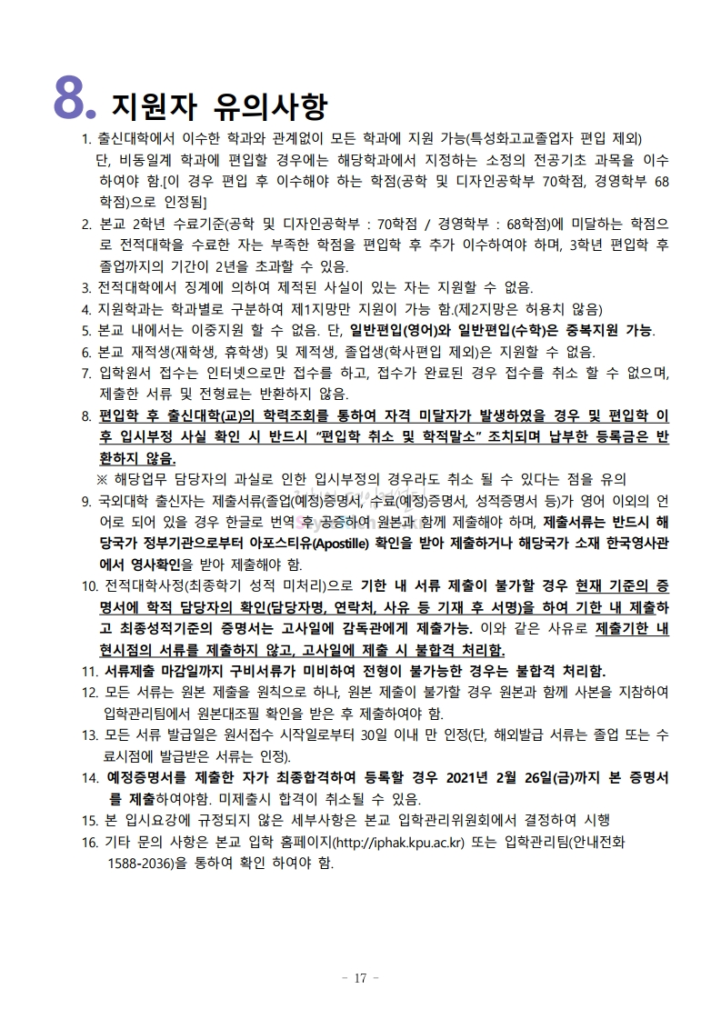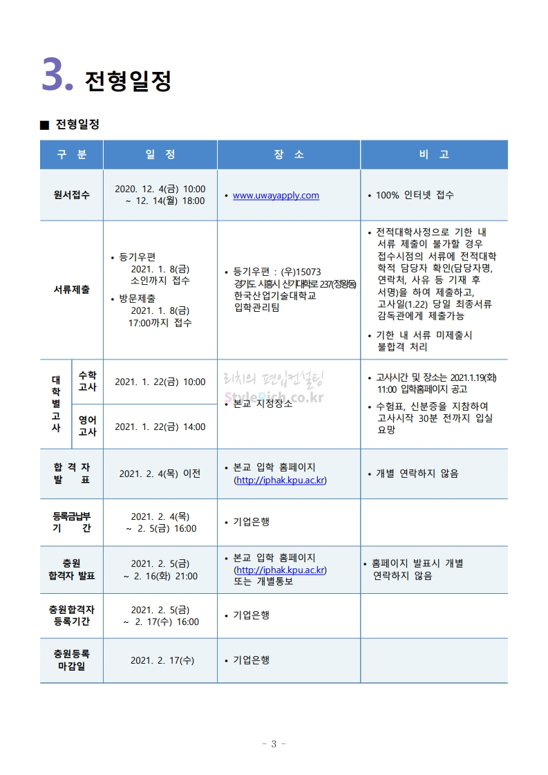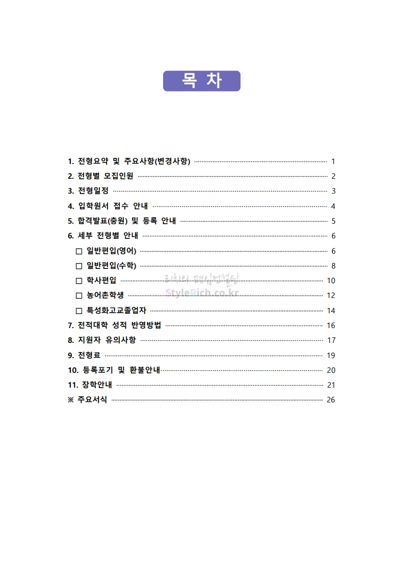 한국산업기술대 편입 2021학년도 모집요강 간편하게 보자! 2020.12.06 12:45 편입 모집요강/2021학년도 모집요강 2021학년도 한국산업기술대 편입 모집요강(2020.12.03 기준)을 간편하게 확인하세요. PC나 모바일에서 이미지를 클릭(터치) 후 이미지의 좌우측을 클릭(터치)하면 모집요강의 순서를 앞뒤로 넘길 수 있습니다. 좌측 클릭(터치)는 이전 페이지, 우측 클릭(터치)는 다음 페이지입니다. * 최종 모집요강 발표 이후에도 내용의 일부가 변경될 수 있으니 지원 전 반드시 한국산업기술대 입학처의 모집요강을 확인 바랍니다. <출처: 한국산업기술대> [한국산업기술대학교] K-MOOC 온라인 공개강좌 소개 👉마케팅조사론👈 공유하기 게시글 관리 리치의 편입컨설팅 저작자표시 비영리 변경금지 (새창열림) '편입 모집요강 > 2021학년도 모집요강' 카테고리의 다른 글 가톨릭대 편입 2021학년도 모집요강 간편하게 보자! (0) 2020.12.06 한국외대 편입 2021학년도 모집요강 간편하게 보자! (0) 2020.12.06 중앙대 편입 2021학년도 모집요강 간편하게 보자! (0) 2020.12.06 인하대 편입 2021학년도 모집요강 간편하게 보자! (0) 2020.12.05 이화여대 편입 2021학년도 모집요강 간편하게 보자! (0) 2020.12.05 댓글 공유하기 다른 글 댓글 이 글 공유하기 구독하기 구독하기 카카오톡 카카오톡 라인 라인 트위터 트위터 Facebook Facebook 카카오스토리 카카오스토리 밴드 밴드 네이버 블로그 네이버 블로그 Pocket Pocket Evernote Evernote 다른 글 가톨릭대 편입 2021학년도 모집요강 간편하게 보자! 가톨릭대 편입 2021학년도 모집요강 간편하게 보자! 2020.12.06 한국외대 편입 2021학년도 모집요강 간편하게 보자! 한국외대 편입 2021학년도 모집요강 간편하게 보자! 2020.12.06 중앙대 편입 2021학년도 모집요강 간편하게 보자! 중앙대 편입 2021학년도 모집요강 간편하게 보자! 2020.12.06 인하대 편입 2021학년도 모집요강 간편하게 보자! 인하대 편입 2021학년도 모집요강 간편하게 보자! 2020.12.05 다른 글 더 둘러보기