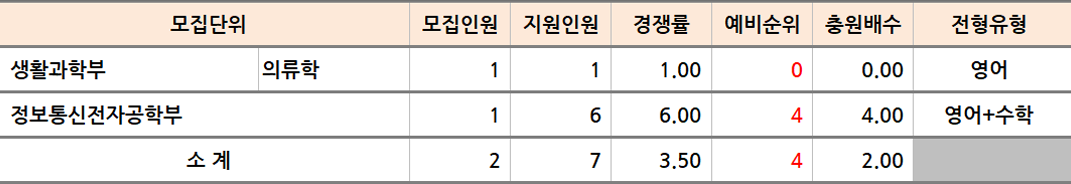 신학과는 모집인원 미달, 음악과(바이올린)은 모집인원만큼만 지원하였습니다.