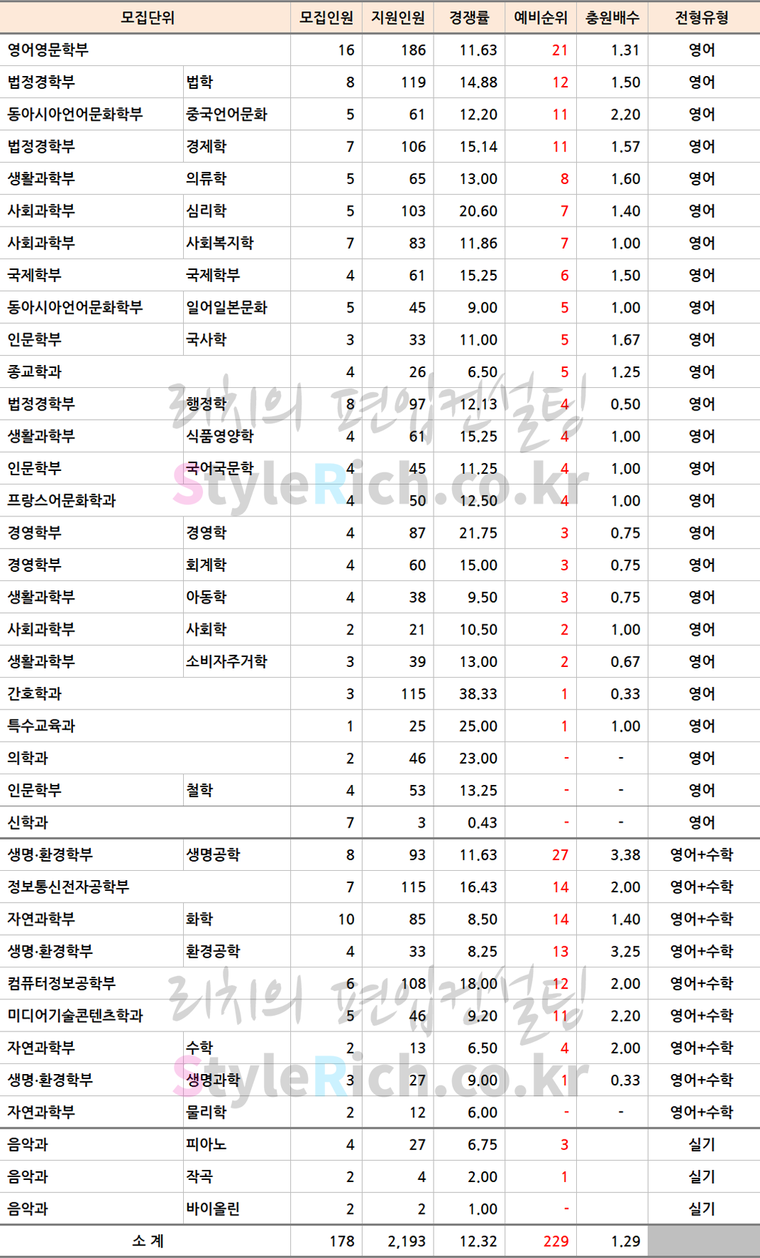* 전형에 따라 영어, 영어+수학, 실기전형 학과로 분류 후 추가합격이 많은 순으로 정렬하였습니다.
