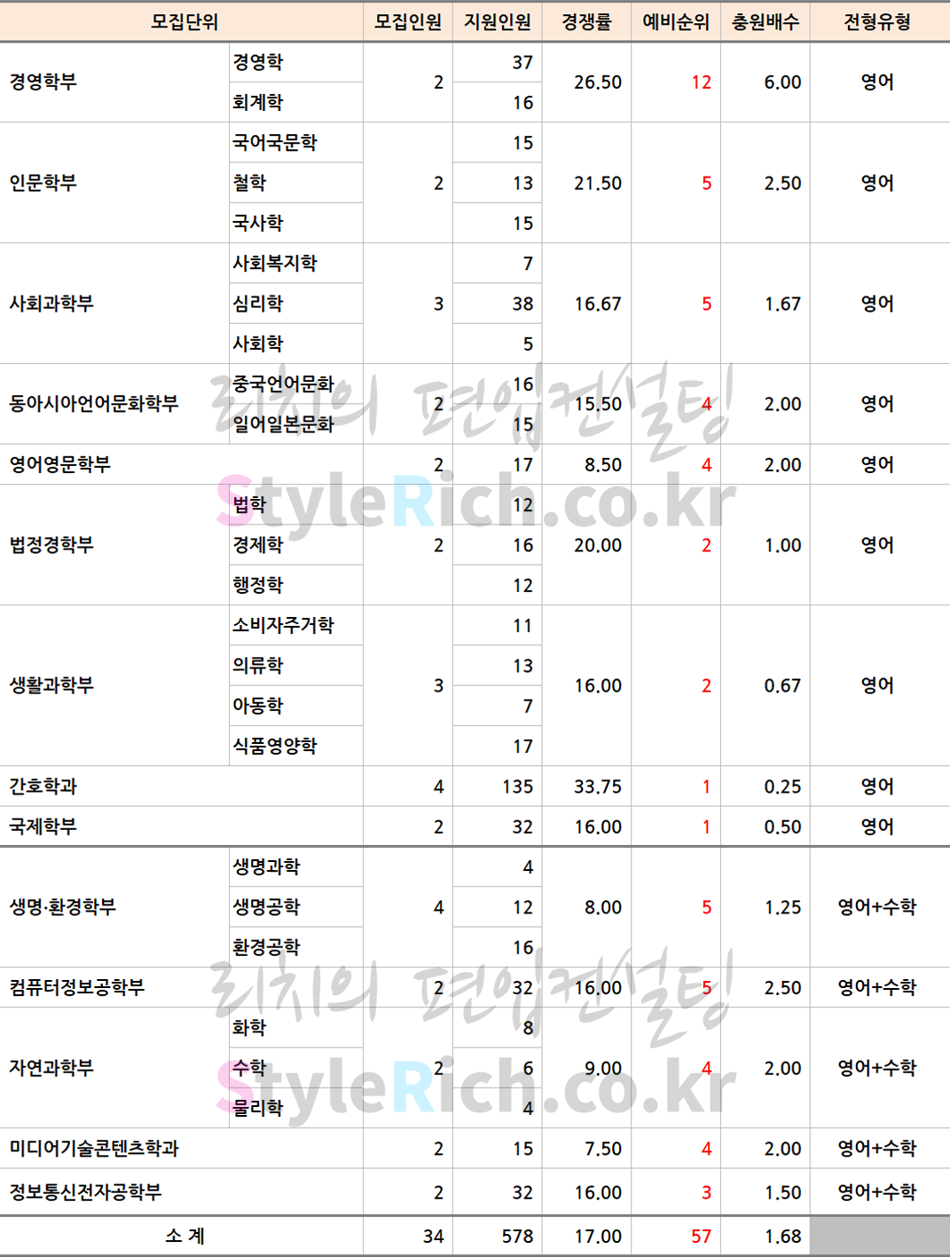* 전형에 따라 영어, 영어+수학, 실기전형 학과로 분류 후 추가합격이 많은 순으로 정렬하였습니다.