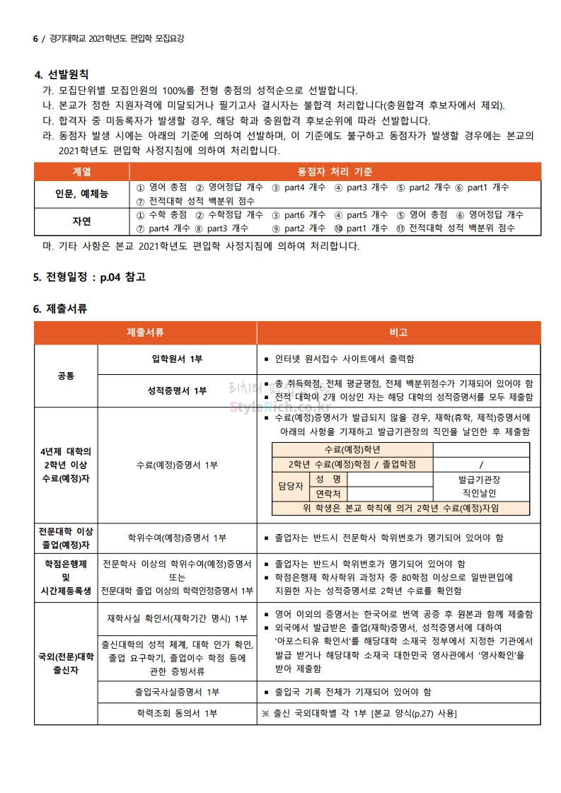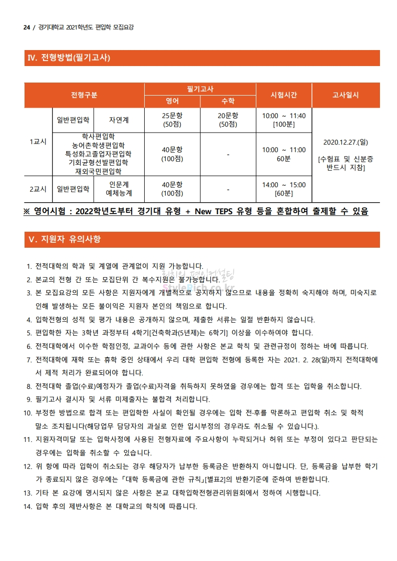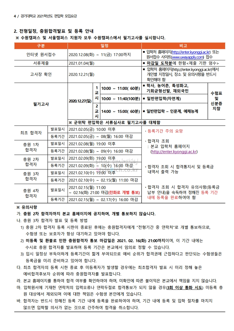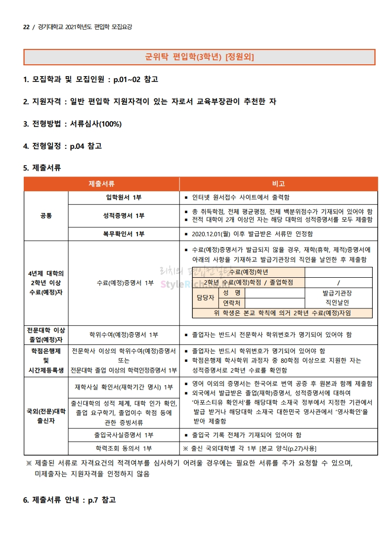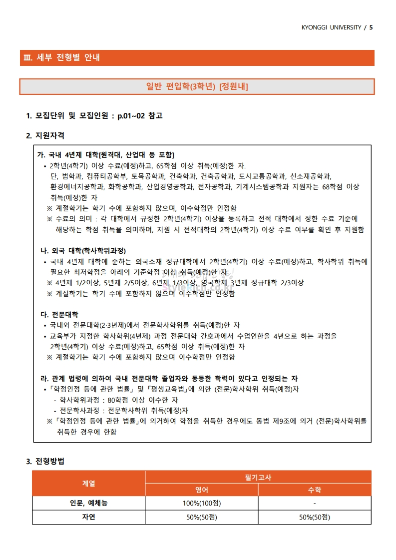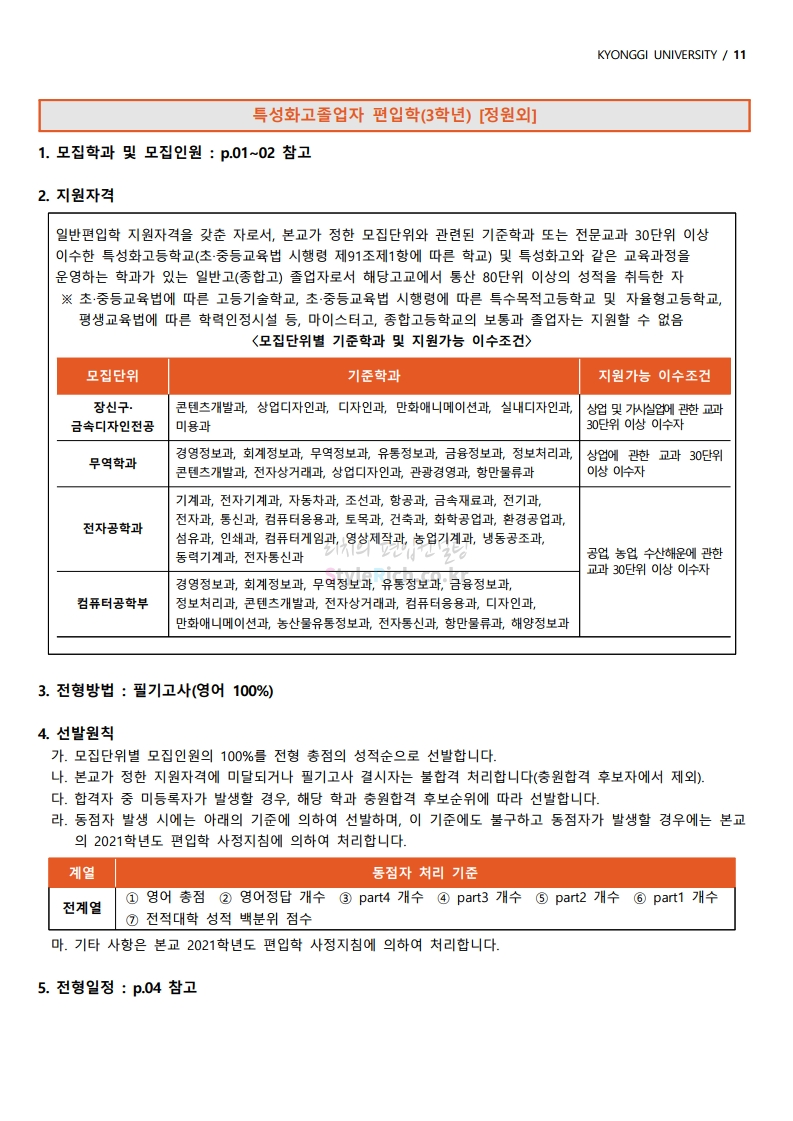 경기대 편입 2021학년도 모집요강 간편하게 보자! 2020.12.06 23:46 편입 모집요강/2021학년도 모집요강 2021학년도 경기대 편입 모집요강(2020.12.02 기준)을 간편하게 확인하세요. PC나 모바일에서 이미지를 클릭(터치) 후 이미지의 좌우측을 클릭(터치)하면 모집요강의 순서를 앞뒤로 넘길 수 있습니다. 좌측 클릭(터치)는 이전 페이지, 우측 클릭(터치)는 다음 페이지입니다. * 최종 모집요강 발표 이후에도 내용의 일부가 변경될 수 있으니 지원 전 반드시 경기대 입학처의 모집요강을 확인 바랍니다. 2021학년도 경기대 편입 모집요강 다운받기 2021학년도 편입학_모집요강.pdf 1.11MB <출처: 경기대> 경기대 웹드라마 [새내기학개론] 2화 공유하기 게시글 관리 리치의 편입컨설팅 저작자표시 비영리 변경금지 (새창열림) '편입 모집요강 > 2021학년도 모집요강' 카테고리의 다른 글 서울시립대 편입 2021학년도 모집요강 간편하게 보자! (0) 2020.12.08 서울과학기술대 편입 2021학년도 모집요강 간편하게 보자! (0) 2020.12.08 가톨릭대 편입 2021학년도 모집요강 간편하게 보자! (0) 2020.12.06 한국외대 편입 2021학년도 모집요강 간편하게 보자! (0) 2020.12.06 한국산업기술대 편입 2021학년도 모집요강 간편하게 보자! (0) 2020.12.06 댓글 공유하기 다른 글 댓글 이 글 공유하기 구독하기 구독하기 카카오톡 카카오톡 라인 라인 트위터 트위터 Facebook Facebook 카카오스토리 카카오스토리 밴드 밴드 네이버 블로그 네이버 블로그 Pocket Pocket Evernote Evernote 다른 글 서울시립대 편입 2021학년도 모집요강 간편하게 보자! 서울시립대 편입 2021학년도 모집요강 간편하게 보자! 2020.12.08 서울과학기술대 편입 2021학년도 모집요강 간편하게 보자! 서울과학기술대 편입 2021학년도 모집요강 간편하게 보자! 2020.12.08 가톨릭대 편입 2021학년도 모집요강 간편하게 보자! 가톨릭대 편입 2021학년도 모집요강 간편하게 보자! 2020.12.06 한국외대 편입 2021학년도 모집요강 간편하게 보자! 한국외대 편입 2021학년도 모집요강 간편하게 보자! 2020.12.06 다른 글 더 둘러보기