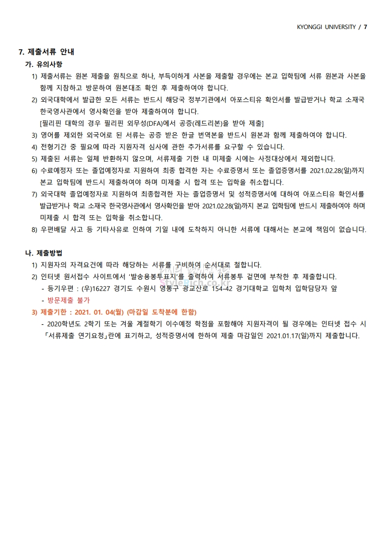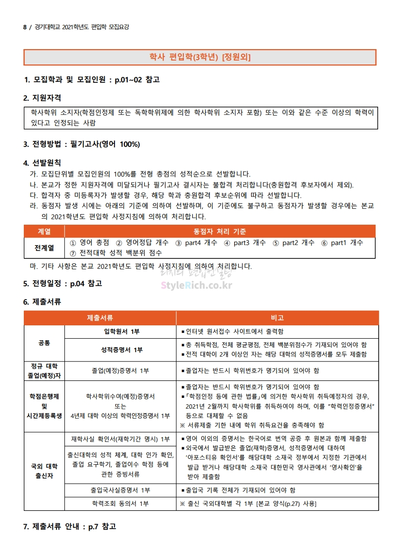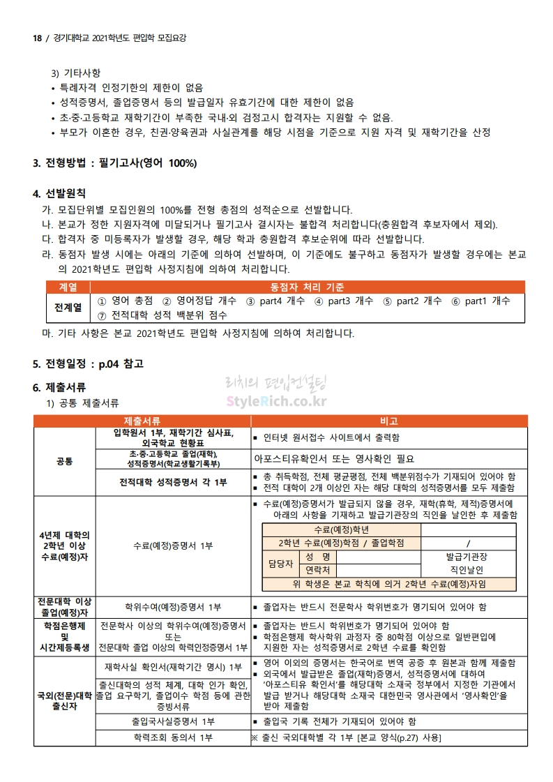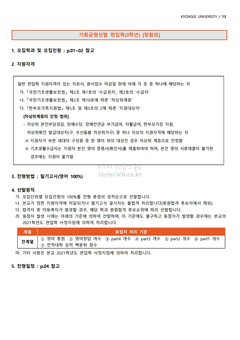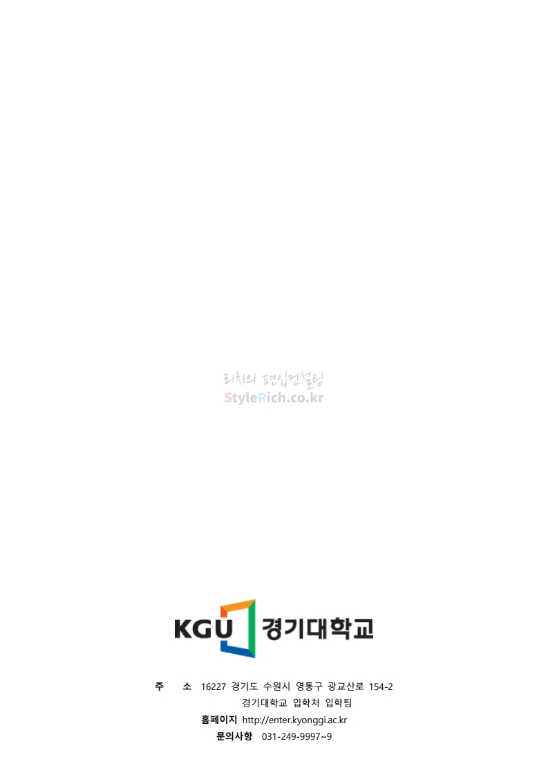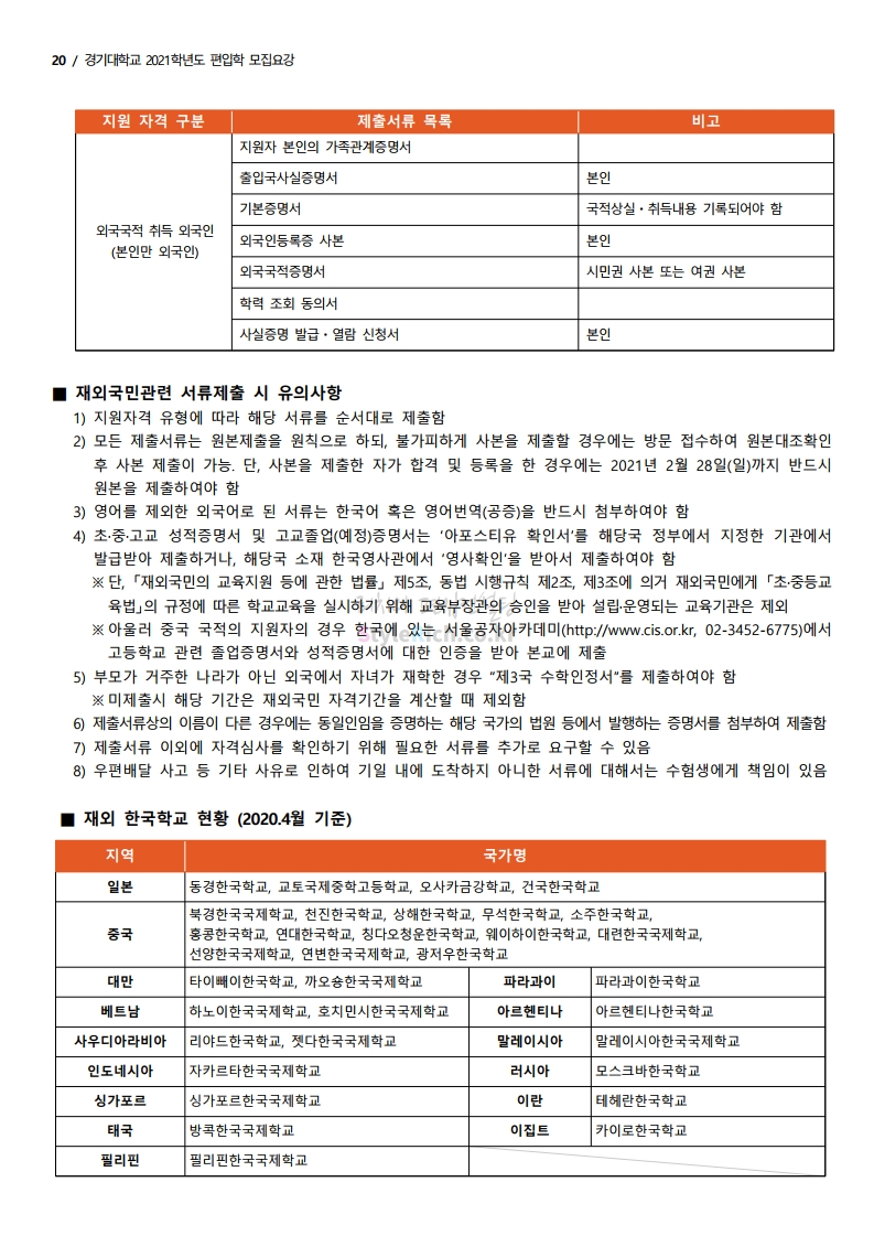 경기대 편입 2021학년도 모집요강 간편하게 보자! 2020.12.06 23:46 편입 모집요강/2021학년도 모집요강 2021학년도 경기대 편입 모집요강(2020.12.02 기준)을 간편하게 확인하세요. PC나 모바일에서 이미지를 클릭(터치) 후 이미지의 좌우측을 클릭(터치)하면 모집요강의 순서를 앞뒤로 넘길 수 있습니다. 좌측 클릭(터치)는 이전 페이지, 우측 클릭(터치)는 다음 페이지입니다. * 최종 모집요강 발표 이후에도 내용의 일부가 변경될 수 있으니 지원 전 반드시 경기대 입학처의 모집요강을 확인 바랍니다. 2021학년도 경기대 편입 모집요강 다운받기 2021학년도 편입학_모집요강.pdf 1.11MB <출처: 경기대> 경기대 웹드라마 [새내기학개론] 2화 공유하기 게시글 관리 리치의 편입컨설팅 저작자표시 비영리 변경금지 (새창열림) '편입 모집요강 > 2021학년도 모집요강' 카테고리의 다른 글 서울시립대 편입 2021학년도 모집요강 간편하게 보자! (0) 2020.12.08 서울과학기술대 편입 2021학년도 모집요강 간편하게 보자! (0) 2020.12.08 가톨릭대 편입 2021학년도 모집요강 간편하게 보자! (0) 2020.12.06 한국외대 편입 2021학년도 모집요강 간편하게 보자! (0) 2020.12.06 한국산업기술대 편입 2021학년도 모집요강 간편하게 보자! (0) 2020.12.06 댓글 공유하기 다른 글 댓글 이 글 공유하기 구독하기 구독하기 카카오톡 카카오톡 라인 라인 트위터 트위터 Facebook Facebook 카카오스토리 카카오스토리 밴드 밴드 네이버 블로그 네이버 블로그 Pocket Pocket Evernote Evernote 다른 글 서울시립대 편입 2021학년도 모집요강 간편하게 보자! 서울시립대 편입 2021학년도 모집요강 간편하게 보자! 2020.12.08 서울과학기술대 편입 2021학년도 모집요강 간편하게 보자! 서울과학기술대 편입 2021학년도 모집요강 간편하게 보자! 2020.12.08 가톨릭대 편입 2021학년도 모집요강 간편하게 보자! 가톨릭대 편입 2021학년도 모집요강 간편하게 보자! 2020.12.06 한국외대 편입 2021학년도 모집요강 간편하게 보자! 한국외대 편입 2021학년도 모집요강 간편하게 보자! 2020.12.06 다른 글 더 둘러보기